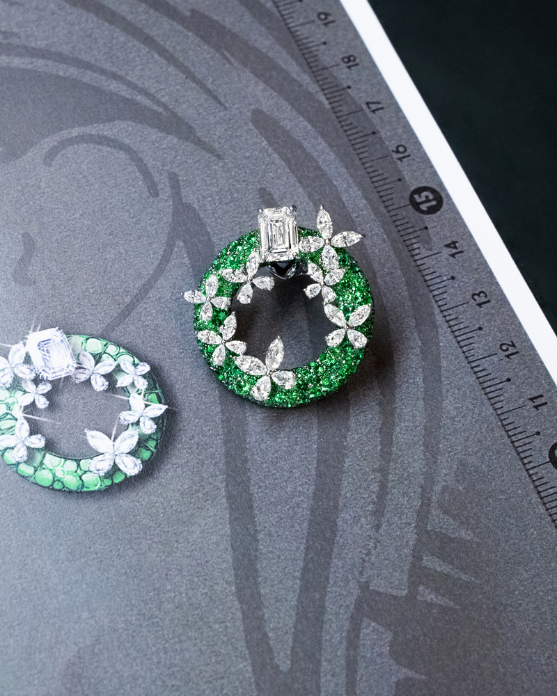 Nesta nova colecção de alta joalharia, a Graff apresenta peças deslumbrantes, concebidas no seu atelier em Mayfair, Londres. Entre os destaques, encontramos um magnífico colar Butterfly High Jewellery, composto por 57,13 quilates com pavé de esmeraldas que desenham um arco curvo ao longo do pescoço, culminando num diamante de corte esmeralda de 5,04 quilates. Um conjunto de borboletas de diamantes em lapidação pêra e marquise adiciona profundidade e dinamismo à peça.
