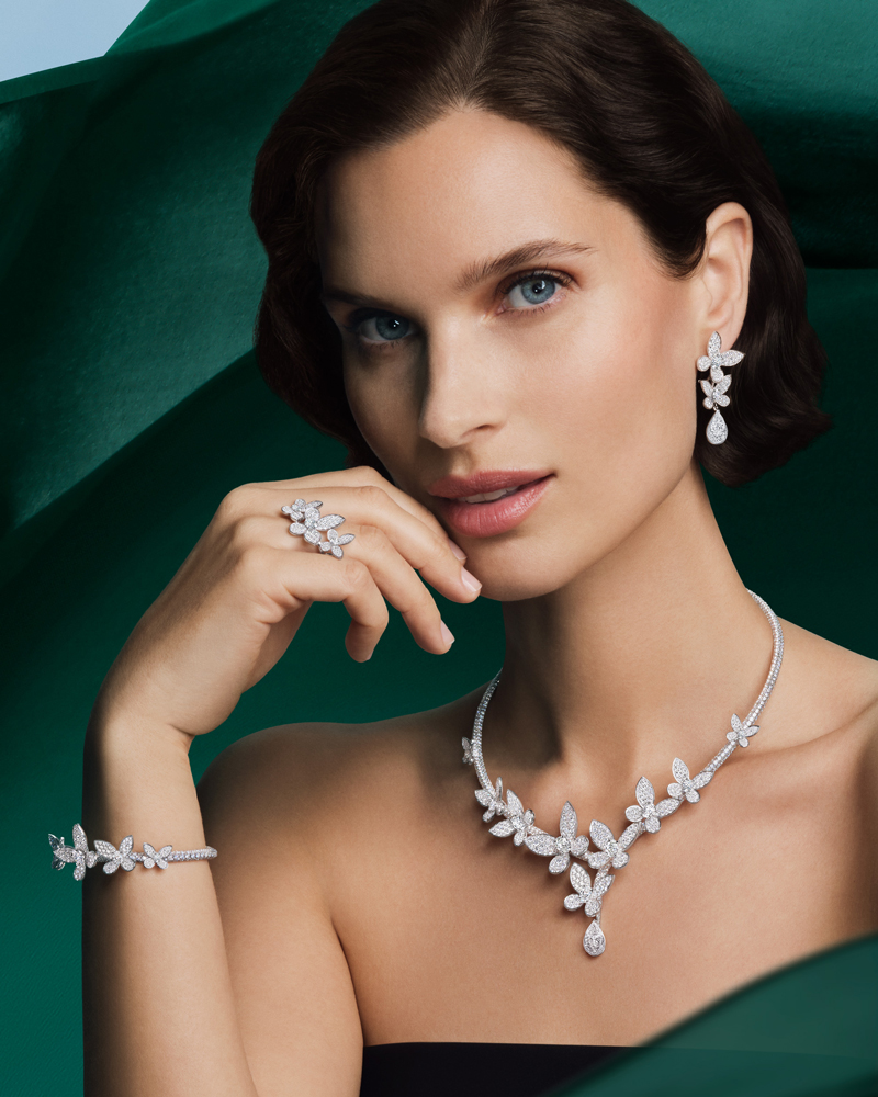 A colecção inclui ainda um conjunto Butterfly Pavé e Diamantes Lapidação Oval, no qual borboletas em pavé de diamantes, com centros em lapidação oval, parecem voar ao longo do pescoço, terminando num diamante em lapidação pêra. Esta peça é complementada por uma pulseira adornada com cinco borboletas estrategicamente posicionadas para criar um efeito de leveza e movimento. Para finalizar, os brincos Butterfly High Jewellery destacam-se pela sua elegância, com borboletas em diamantes e gotas em lapidação pêra, garantindo um brilho sublime e um toque de sofisticação.