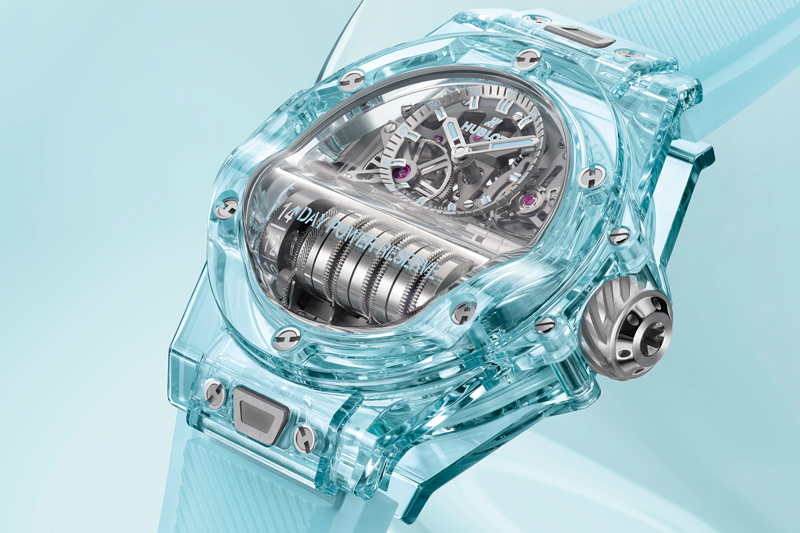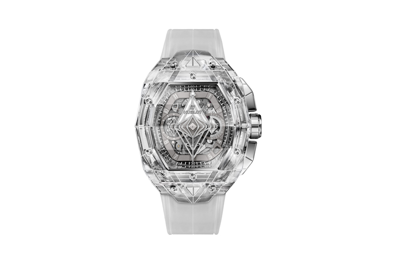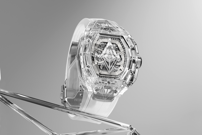 A transparência da safira amplia a precisão das características do Sang Bleu, resultando num estilo minimalista ultra-leve, tanto visualmente como no pulso. Apesar do exigente processo de produção, o Spirit of Big Bang Sapphire Sang Bleu é quase tão duro e resistente a riscos como o diamante, graças a mais de 100 horas de maquinação 3D.