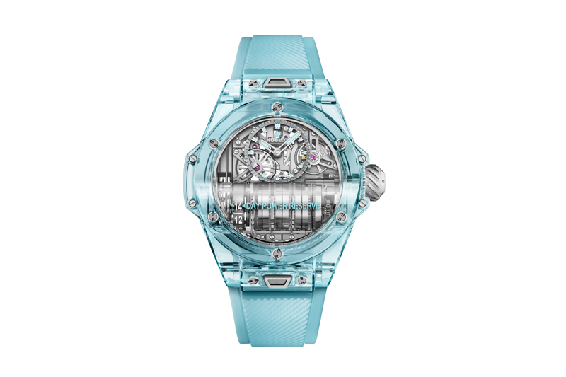 A Hublot apresenta o MP-11, um relógio conhecido pelo movimento escultural de 7 tambores e pela impressionante reserva de marcha de 2 semanas, agora lançado numa nova e deslumbrante cor de safira: azul água radiante e translúcido. Este relógio marca uma estreia significativa para a série Manufacture Piece da Hublot, acrescentando uma nova tonalidade à sua paleta de tons de safira.