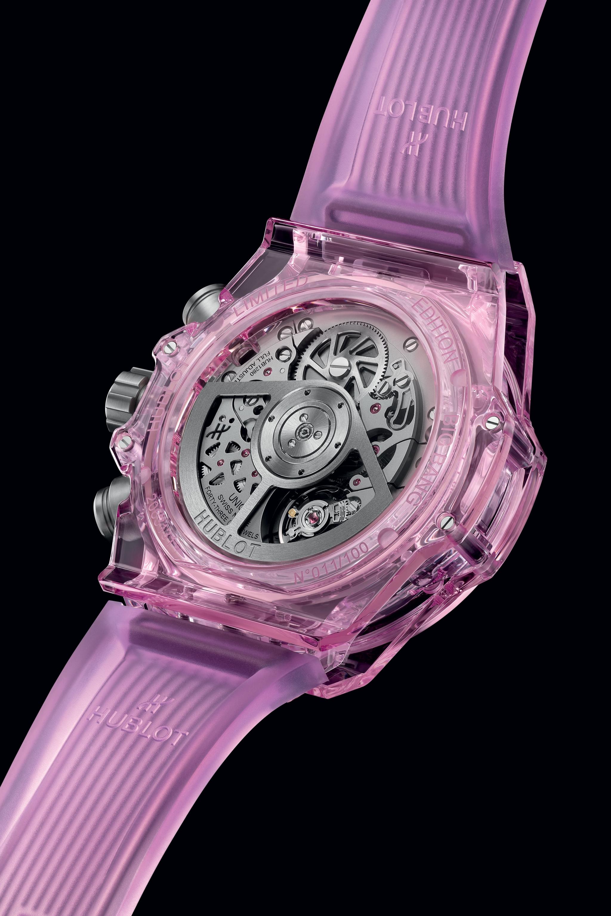 A fusão entre o movimento e a caixa é conseguida através da utilização de safira sintética, um material que oferece transparência ao mesmo tempo que assegura a proteção do mecanismo. Com um tamanho de 42 mm, a caixa em vidro de safira rosa polido é combinada com uma luneta a condizer. O mostrador esqueletizado em resina composta transparente polida, aumenta ainda mais o atrativo visual do relógio. A bracelete, fabricada em borracha estruturada transparente rosa, é fixada com uma fivela de alumínio rosa e aço inoxidável, garantindo conforto e estilo.