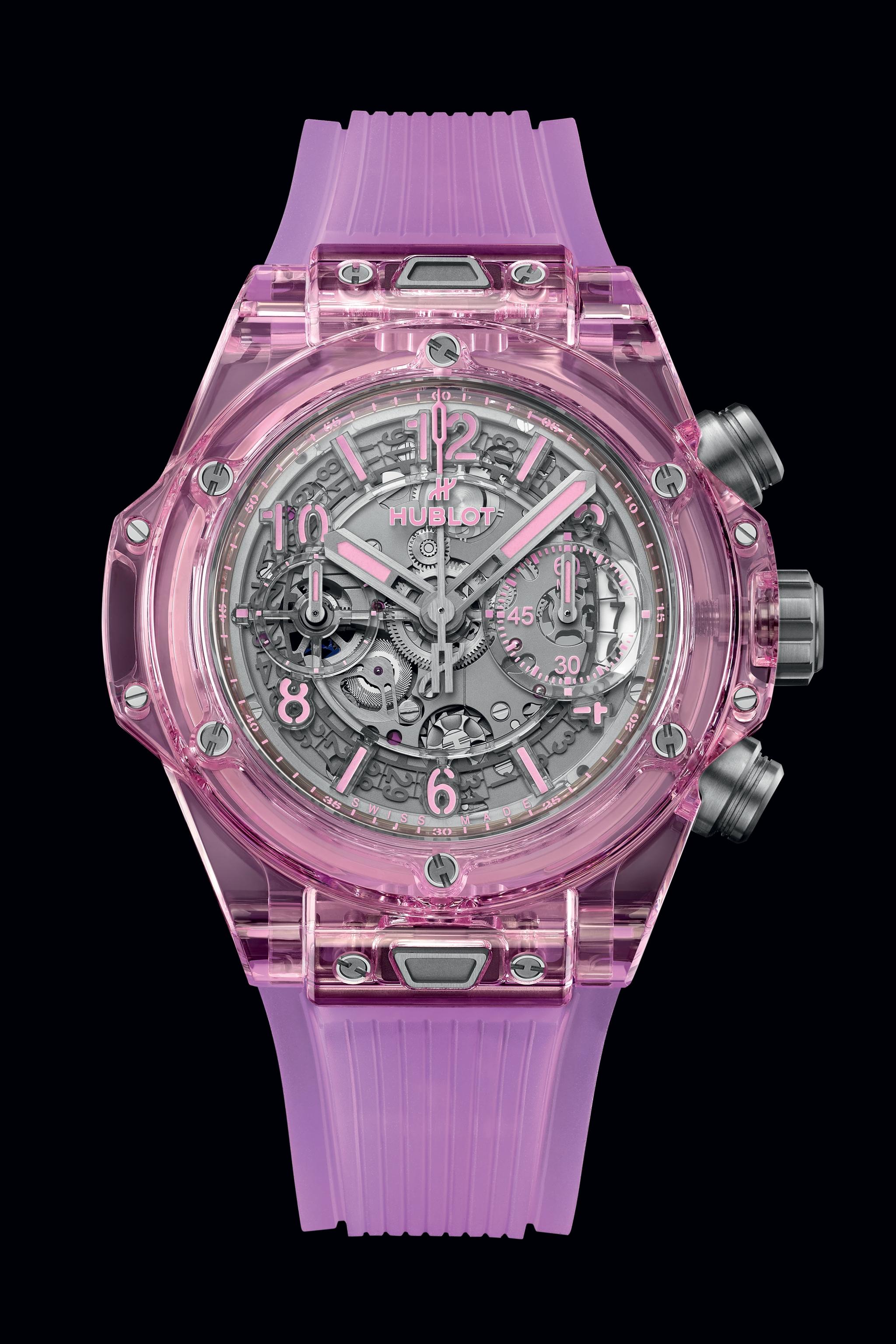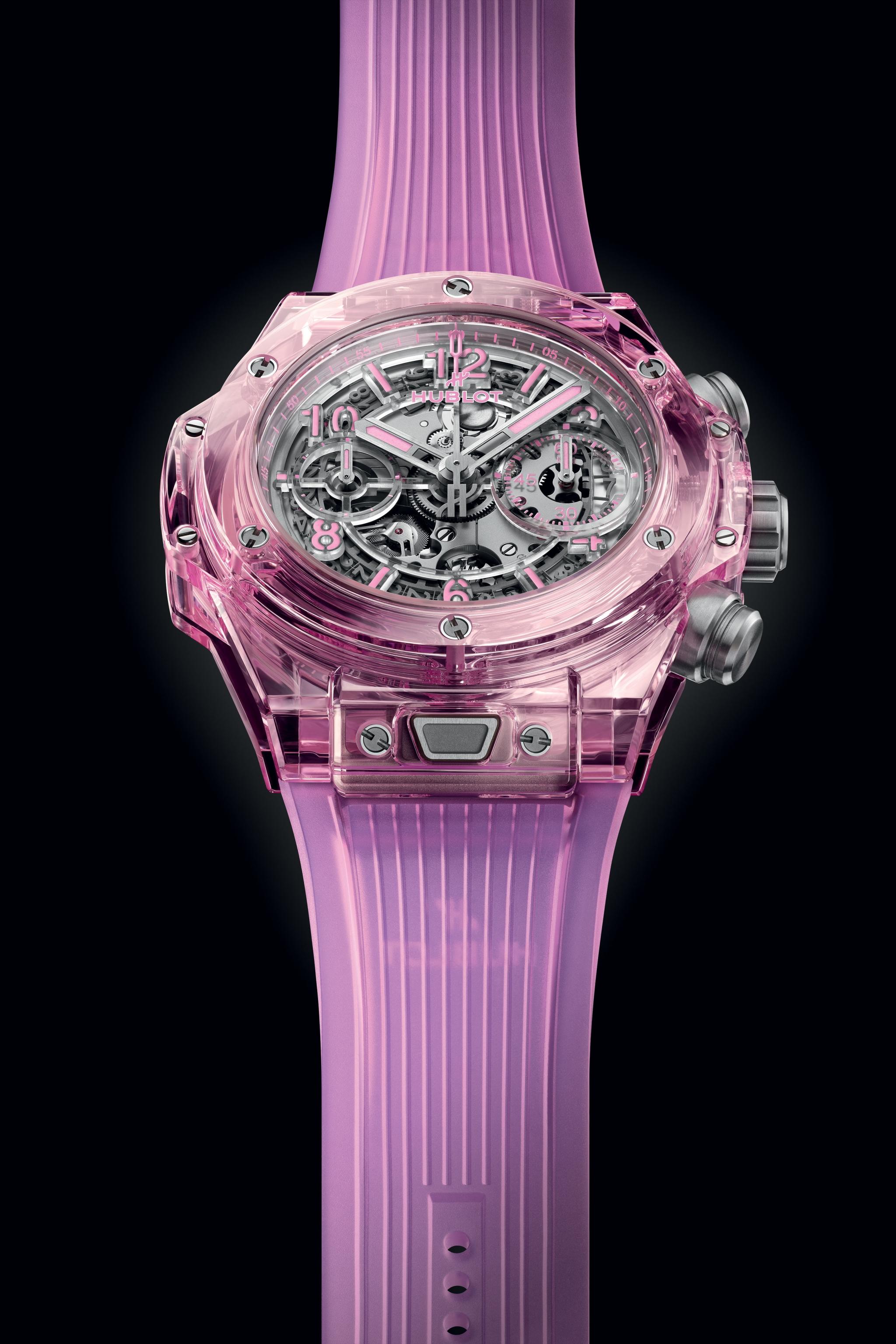 A Hublot apresenta uma reinterpretação do Big Bang Unico Sapphire 42 mm. A caixa deste relógio é feita em vidro de safira rosa polido, oferecendo uma mistura única de transparência e durabilidade. Com uma resistência à água de 50 metros, este relógio de edição limitada é tão funcional quanto elegante.