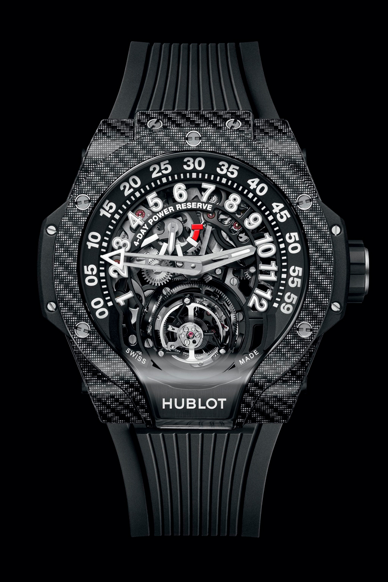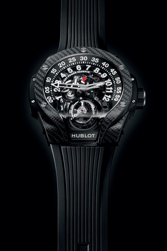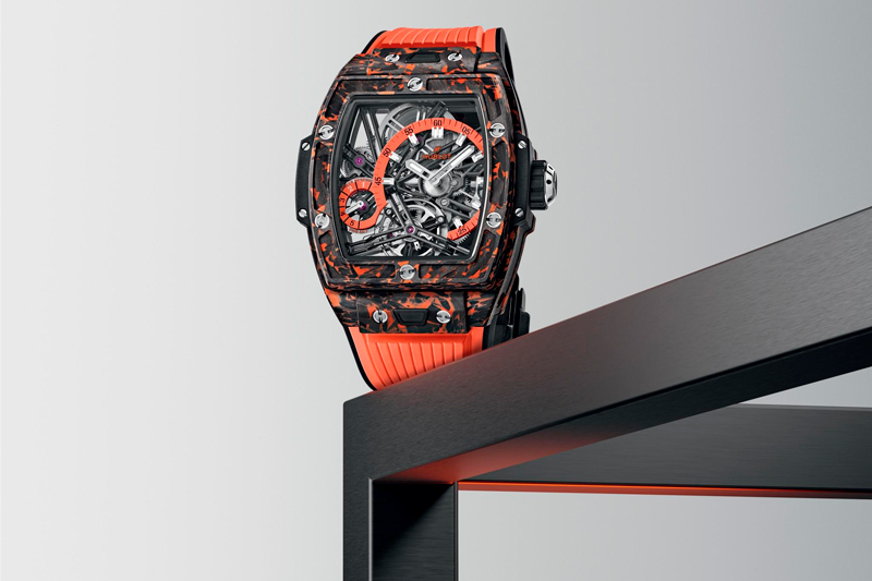 Com um design emocionante, o relógio Spirit Of Big Bang Tourbillon 5-Day Power Reserve é a mais nova adição à coleção Spirit Of Big Bang e é limitado a apenas 50 peças. A caixa de 42 mm é composta por fibra de carbono, com microfibras de vidro laranja, e combinada com uma bracelete de borracha preta e laranja no mesmo tom vibrante. Alimentado pelo movimento turbilhão de corda manual MHUB6020, com reserva de marcha de 115 horas (5 dias), este relógio conta com uma resistência à água de até 50 m.