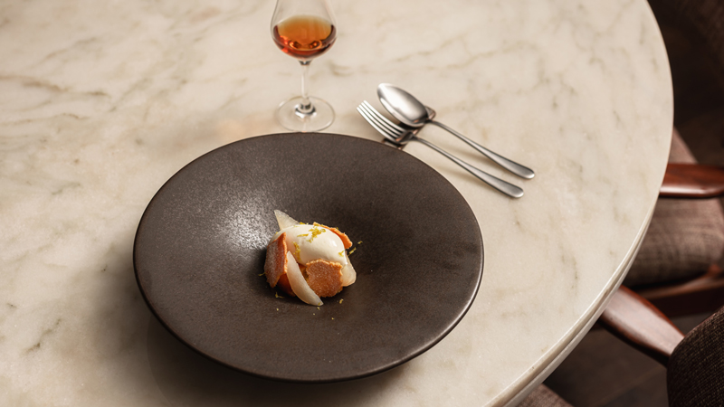 Seguiram-se os Boletus – apanhados pelo próprio – envolvidos em gema de ovo e espinafres, numa harmonia outonal sublinhada pelo rosé da Quinta do Sobreiro de Cima 2020. Fábio Pereira contra-argumentou com leveza marítima: pregado com limão queimado e alga kombu. Depois, a presa de porco ibérico com couve-flor e acelga, onde o sabor profundo da carne se equilibrava com a delicadeza vegetal.