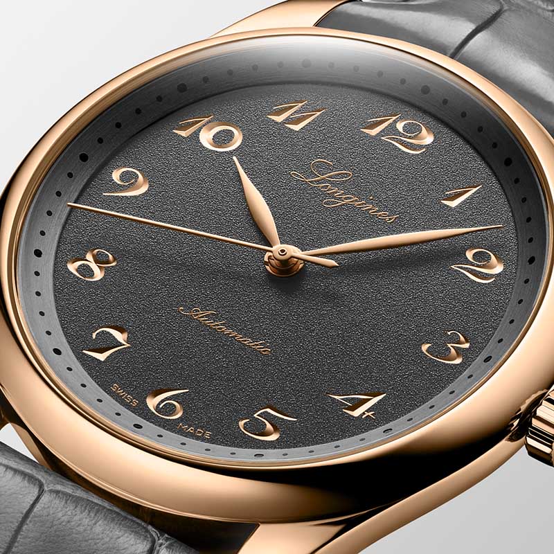 Prateado (aço), cinzento (ouro amarelo) ou antracite (ouro rosa), ponteiros em forma de folha, numerais árabes gravados na cor da caixa, indicação de horas, minutos e segundos