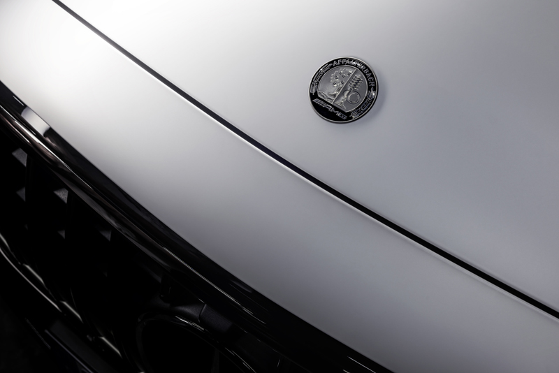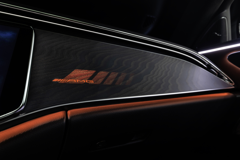 No interior do veículo, o modelo está equipado de série com acabamentos interiores em madeira de freixo porosa cinzenta, com insígnia AMG iluminada. O MBUX Superscreen com display do passageiro dianteiro está disponível como opção. O sistema multimédia MBUX oferece displays e funcionalidades específicos da AMG, assim como os menus adicionais e exclusivos AMG Performance e AMG TRACK PACE (opcional). A estes juntam-se os grafismos e funções específicos dos modelos híbridos. Isto inclui o menu de carregamento no painel de instrumentos e no display multimédia. Estes fornecem informações sobre, entre outros, o estado de carga e a temperatura da bateria de alta tensão, bem como a autonomia eléctrica.