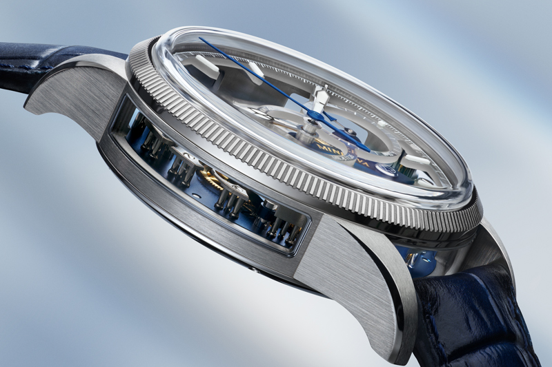 A Montblanc acolhe o novo 1858 Unveiled Minerva Cronógrafo Monobotão, uma edição limitada com detalhes fascinantes e uma abordagem arquitetónica distinta. Cinco aberturas na lateral da caixa permitem a entrada de luz para iluminar os 291 componentes do movimento de corda manual, o Calibre MB M17.26, projetado para exibir toda a ação mecânica no lado do mostrador do relógio. A complicação cronógrafo, com roda de colunas, permite que a luz entre, destacando os detalhes artesanais, enquanto as platinas e pontes de prata alemã são coloridas num azul contemporâneo, combinando com a pulseira em pele azul sfumato.
