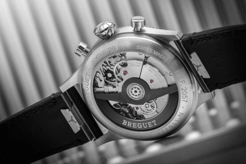 Como referido anteriormente, a Breguet apresenta não uma, mas duas edições do seu emblemático relógio piloto flyback. Assim, o Breguet Type 20 Cronógrafo 2057 é uma homenagem aos primeiros relógios militares, equipado com uma luneta rotativa, sem marcações, com apenas um triângulo luminoso a marcar o zero. Além disso, a coroa é em forma de pêra. Quanto ao mostrador, o visor conta com apenas dois contadores, um de pequenos segundos e outro de 30 minutos, este último com um ponteiro luminoso em forma de gota, enquanto o ponteiro dos pequenos segundos também é luminescente. As graduações deste contador de minutos são simples e os ponteiros centrais são grandes e luminescentes em forma de lápis.