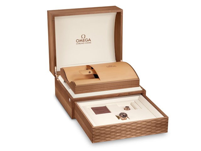O Omega 1932 Olympic Chrono Chime apresenta-se numa pulseira em pele castanha com sistema Quick-Change, bem como com dois cordões em pele para poder ser usado como relógio de bolso ou pescoço. Este modelo é entregue numa caixa de apresentação de nogueira com uma placa de ressonância feita de abeto para amplificar o ritmo preciso, tom, harmonia e duração de cada badalada.
