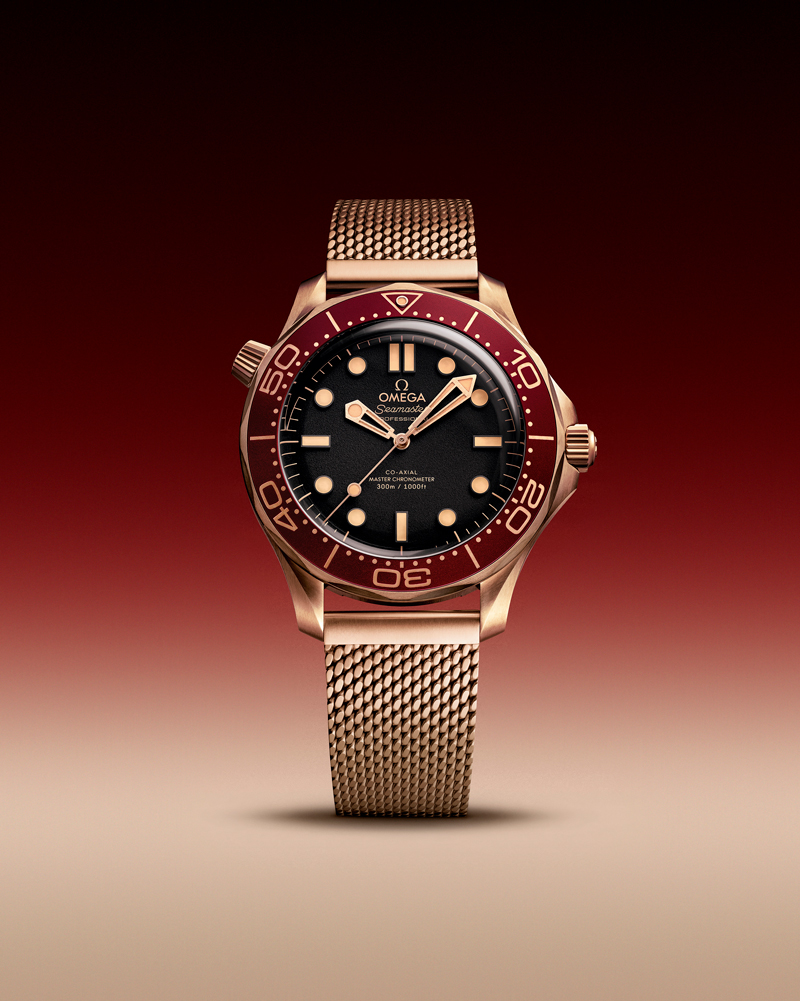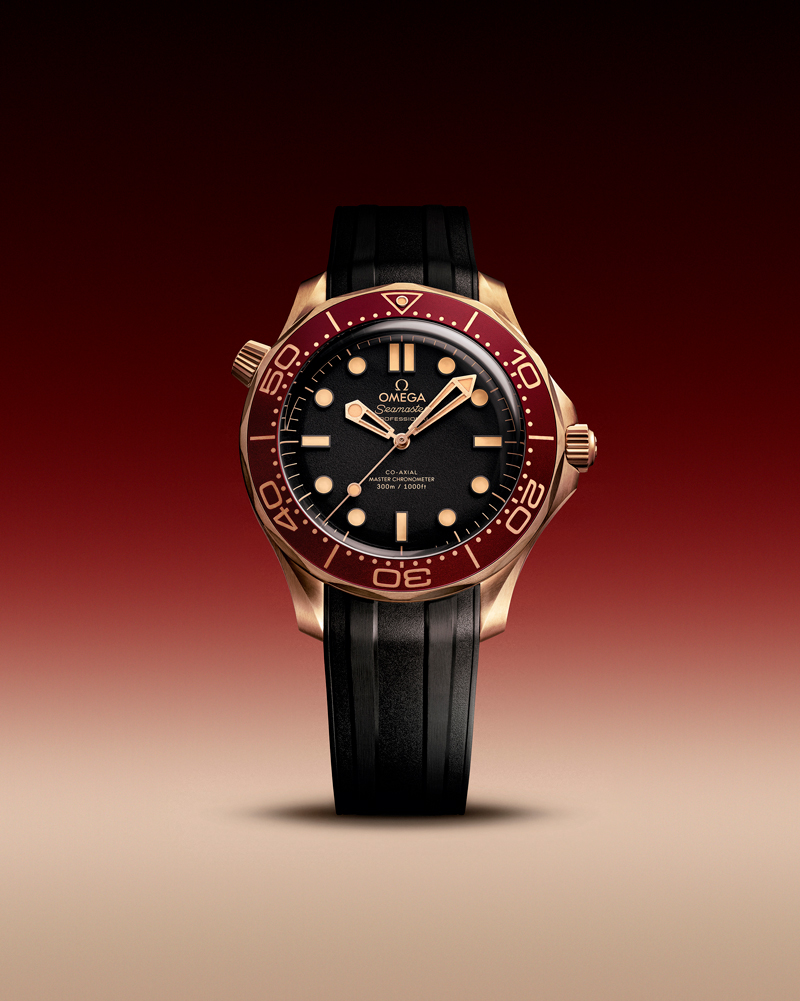 Inspirando-se no modelo especial “No Time to Die”, usado por Daniel Craig no universo James Bond, o novo Seamaster Diver 300M abdica da janela de data, optando por uma apresentação mais limpa e nostálgica. Este layout, agora a integrar permanentemente a colecção, é complementado por um mostrador em alumínio preto jateado e uma luneta bordeaux profundo, uma tonalidade obtida por anodização com ácido oxálico.