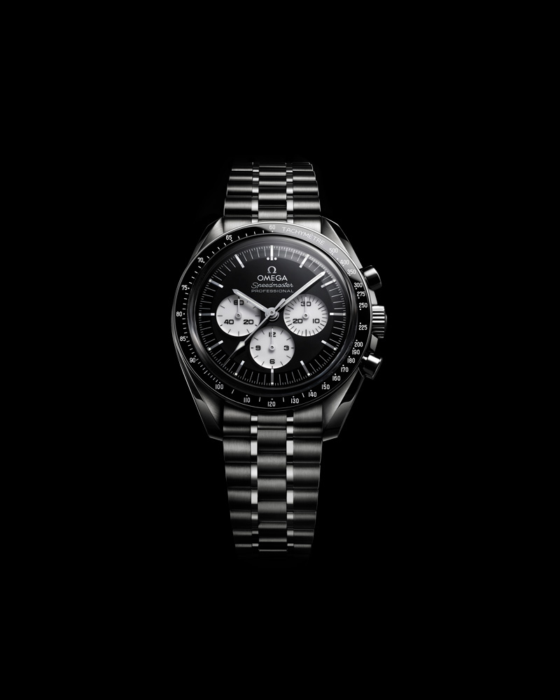 A versão em aço aposta numa configuração mais técnica, com ponteiros e índices revestidos a ródio preenchidos com Super-LumiNova branca. É a interpretação mais próxima do espírito utilitário que sempre caracterizou o Speedmaster.