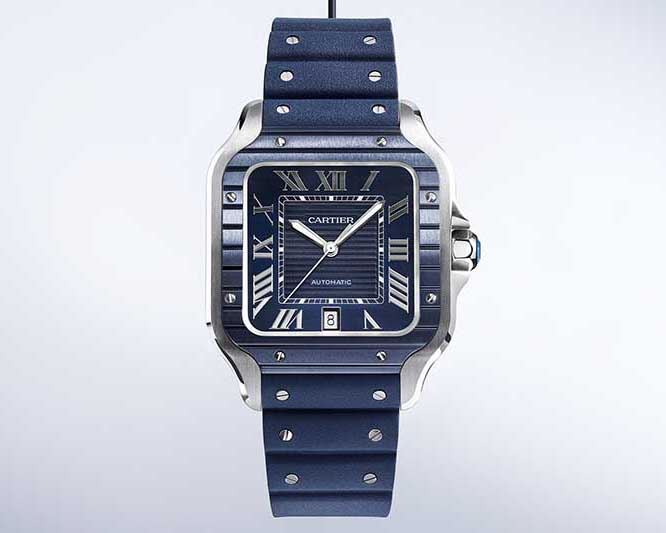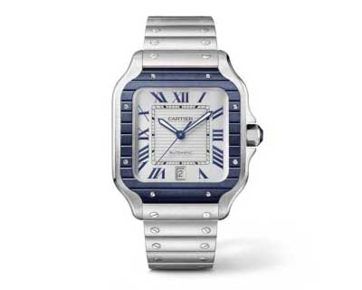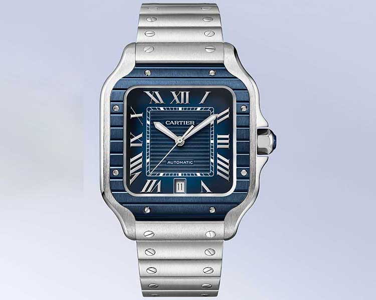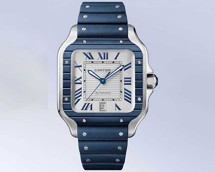 A colecção Santos de Cartier recebe novos modelos com lunetas azuis e novos mostradores, ambos com um padrão listado inédito. Assim, o modelo grande em aço (39,8 mm x 47,5 mm) disponibiliza, pela primeira vez nesta linha, uma luneta revestida a PVD azul, decorada com ranhuras horizontais. Outra novidade reside nos mostradores que, baseando-se no mesmo conceito da luneta, apresentam também uma área central com ranhuras horizontais e estão disponíveis em azul escuro escovado ou prateado escovado.