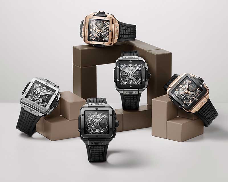 A Hublot apresenta a sua própria interpretação do relógio quadrado, uma forma totalmente nova para a marca. O Hublot Square Bang Unico é uma reinterpretação do Big Bang, alojado numa caixa quadrada. A nova colecção disponibiliza cinco modelos de 42 mm em três materiais distintos: dois relógios em titânio com luneta em titânio ou cerâmica preta; dois modelos em King Gold, com luneta no mesmo material ou em cerâmica; e uma versão All Black, em cerâmica preta.
