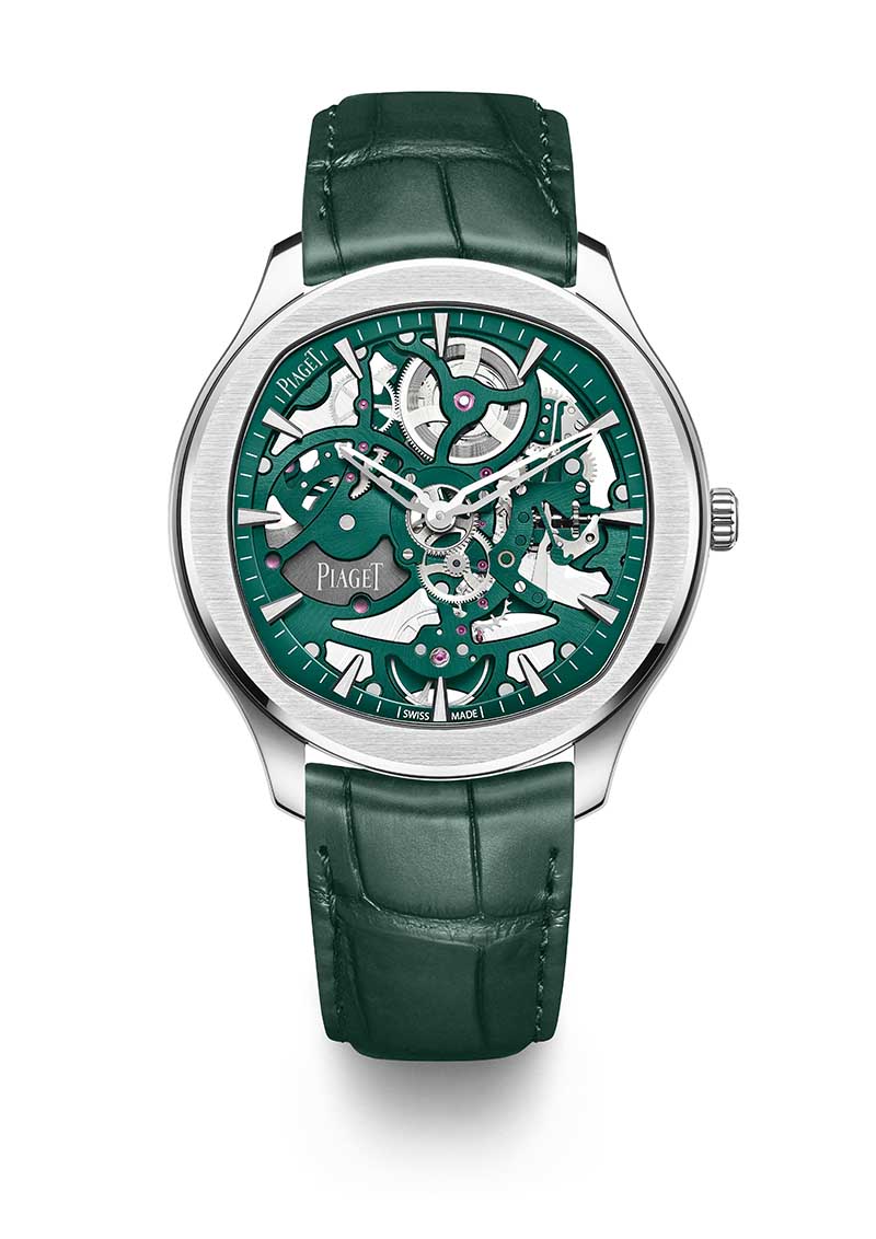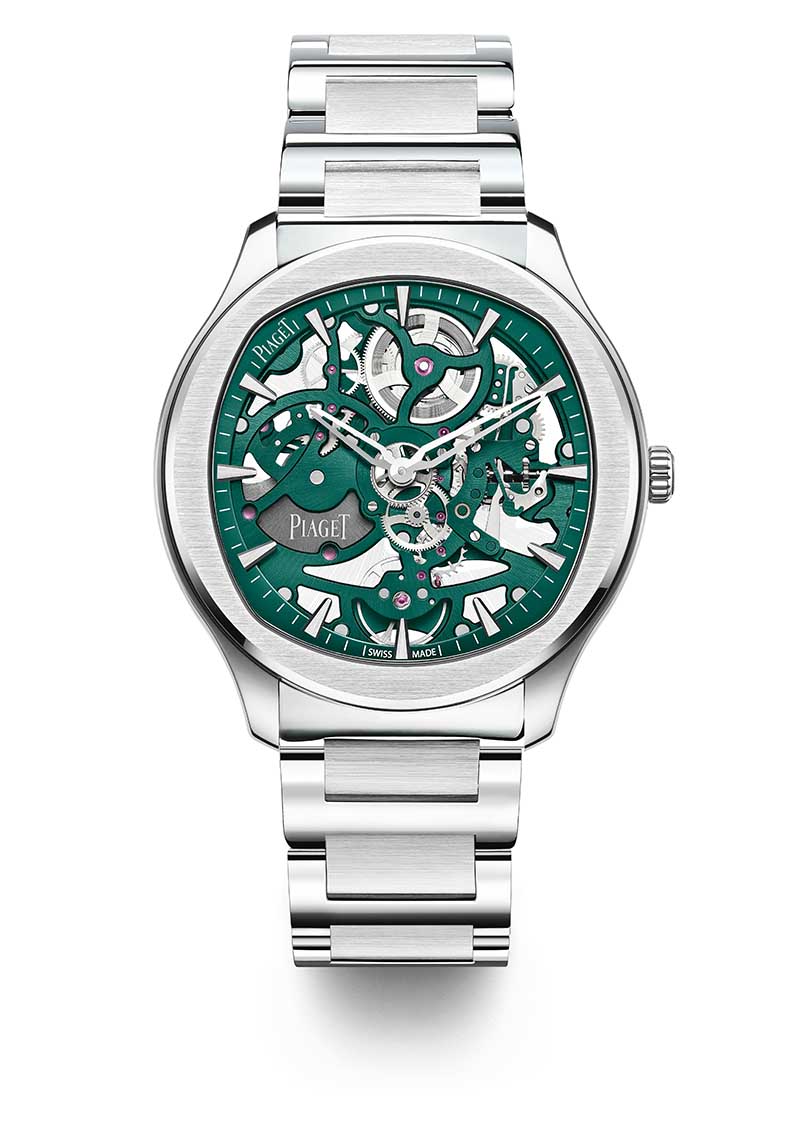 A nova versão do Piaget Polo Skeleton é entregue com uma pulseira em aço polido/escovado e uma pulseira em pele de crocodilo verde, ambas intercambiáveis.