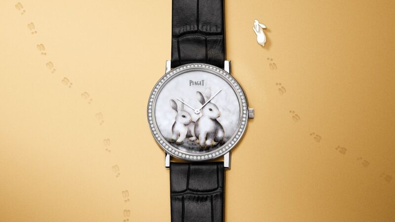 O adorável par de coelhos no mostrador é realizado através da antiga arte da esmaltagem cloisonné Grand Feu executada pela mestre esmaltadora Anita Porchet. A representação realista do animal é emoldurada por uma caixa em ouro branco com luneta engastada com diamantes de corte brilhante. Esta edição especial Piaget é limitada a 38 peças.