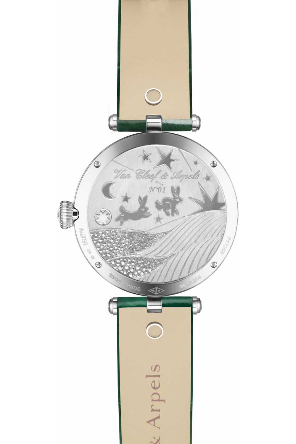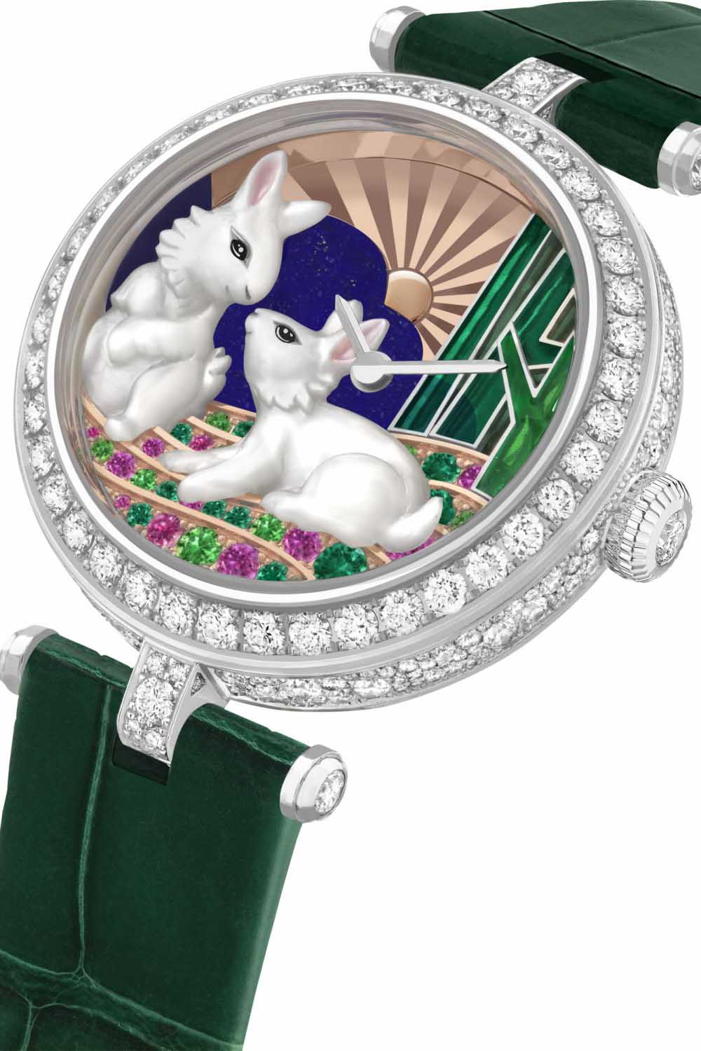 Limitado a oito peças, este modelo da colecção Classique apresenta-se numa caixa de ouro branco engastada com diamantes. No mostrador, o trabalho em esmalte e a gravação à mão dão vida a um cenário onde seis coelhos brincam por entre as nuvens.