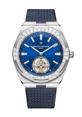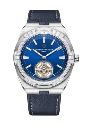 A Vacheron Constantin escolheu o modelo Overseas Turbilhão para apresentar duas novidades na coleção inspirada no espirito das viagens. Pela primeira vez, este modelo veste-se de ouro branco e apresenta um total de 85 diamantes engastados na luneta de seis faces e nos indicadores, o que lhe confere contrastes cromáticos. Ao contrário dos outros modelos da coleção, os diamantes engastados são de lapidação baguette. Para contrastar com o ouro branco e os diamantes, o mostrador azul, característico da coleção, completa este design sofisticado.