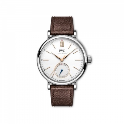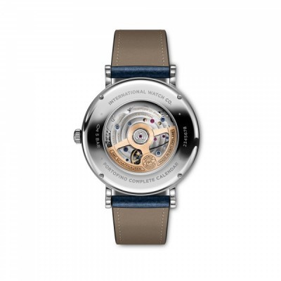 O Portofino Calendário Completo ostenta uma caixa de 41 milímetros em ouro 5N de 18 quilates ou em aço inoxidável. Este relógio é o primeiro da IWC a contar com o recém-desenvolvido módulo de calendário completo. O submostrador das 12 horas exibe o dia da semana e a fase da lua, enquanto o das 6 horas exibe a data e o mês. Cada indicação pode ser ajustada independentemente através da coroa ou usando os dois botões corretores integrados na lateral da caixa. O calendário precisa de ser ajustado manualmente apenas nos meses com menos de 31 dias. Todas as indicações avançarão automaticamente um dia por volta da meia-noite.