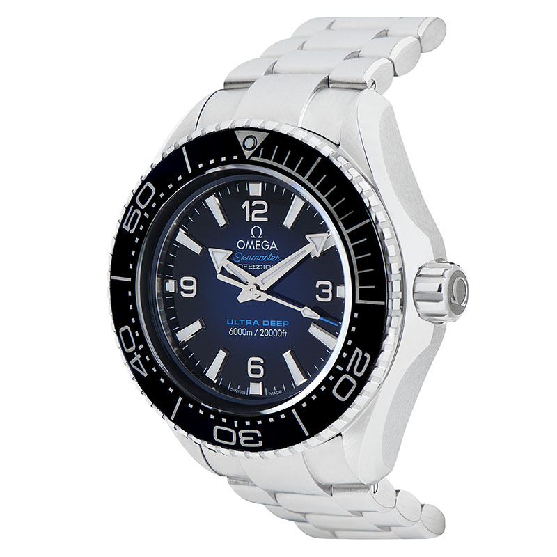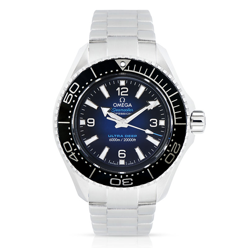 Apresentado em 2022 como a expressão máxima da relojoaria de mergulho da marca, o Omega Seamaster Planet Ocean Ultra Deep destaca-se pela sua caixa de 46 mm em aço e pela impressionante estanqueidade até 600 metros. O mostrador azul, em conjunto com a luneta em cerâmica também azul, oferece elevada legibilidade, reforçada pelos índices e ponteiros com tratamento Super-LumiNova.