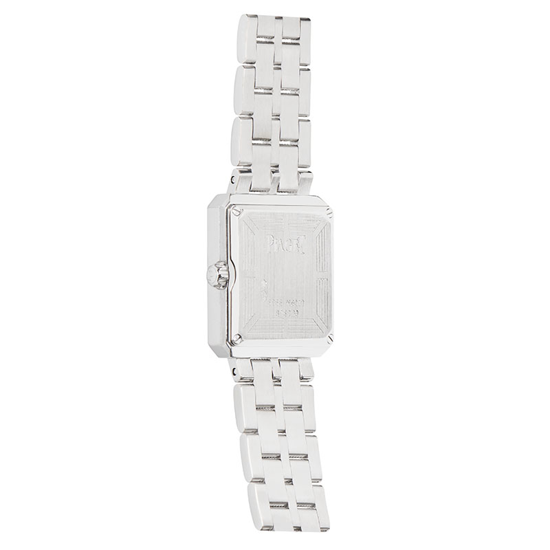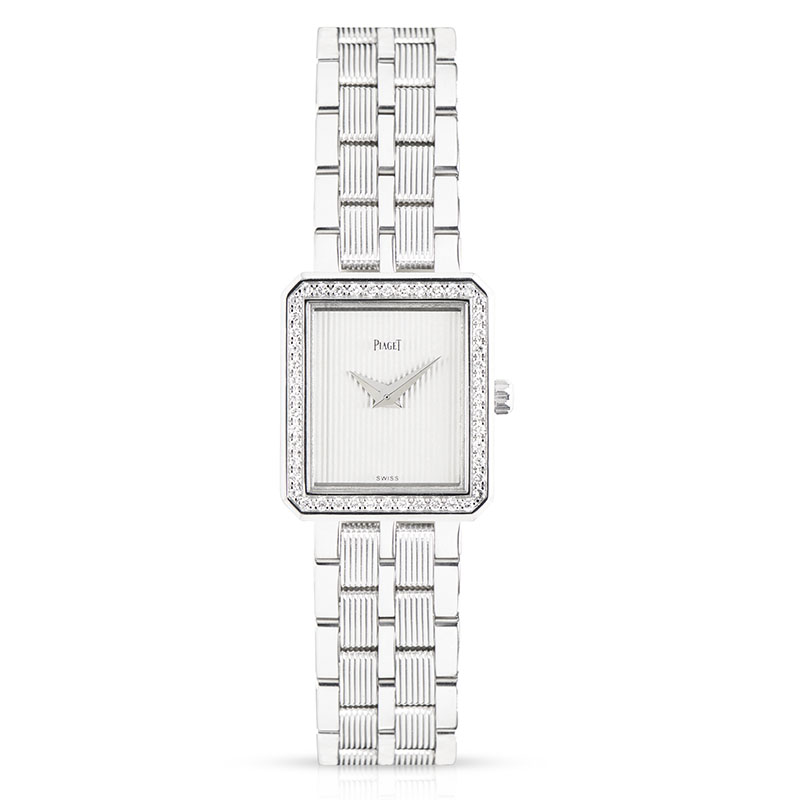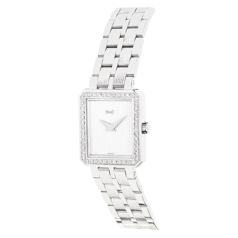 O Piaget Protocole distingue-se pela sua elegância intemporal, expressa na caixa rectangular em ouro branco com diamantes, de 28 x 20 mm, complementada por um mostrador prateado minimalista com ponteiros finos. Uma estética discreta e sofisticada, fiel ao espírito da Maison suíça, fundada em 1874 e internacionalmente reconhecida pelos seus movimentos ultrafinos e pela excelência artesanal.