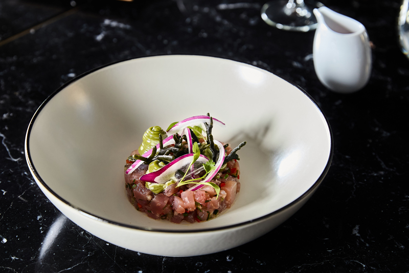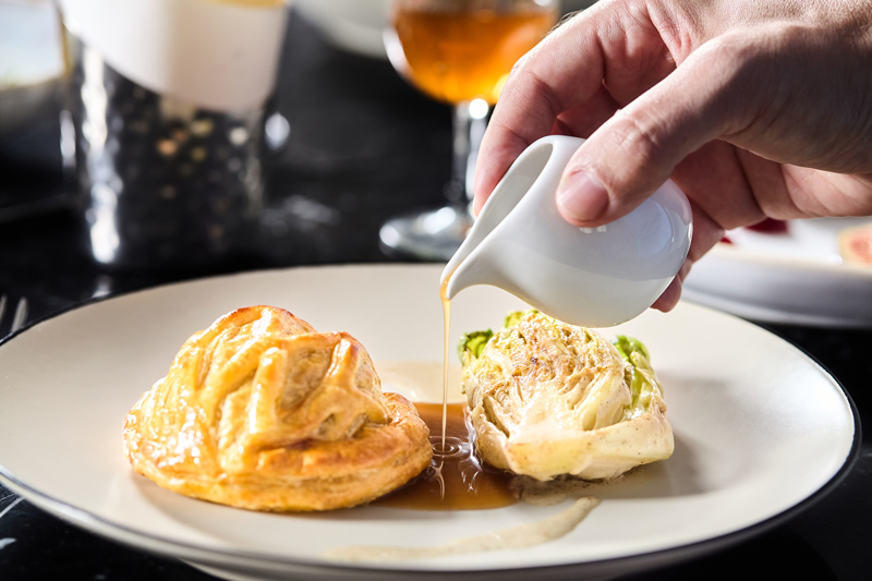 O menu do Cafeína é um retrato fiel da sua trajectória. O icónico bife Wellington, servido à sexta-feira ao almoço num carrinho de serviço clássico, é uma verdadeira experiência sensorial. "Fomos dos primeiros a servi-lo na cidade. No fundo, democratizámos o Wellington", diz Vasco, com um sorriso. Outro exemplo é o tártaro de atum, introduzido em 2021 e que rapidamente conquistou o paladar dos clientes, mantendo-se na carta até hoje.