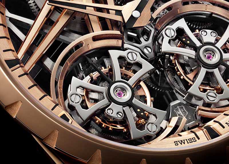 A imponente caixa de 45 mm do novo relógio está disponível em três versões: ouro rosa, ouro branco e uma versão engastada com diamantes de corte baguette. Lá dentro bate o novo calibre DFT RD108SQ, uma reinterpretação do RD105SQ, que foi o primeiro movimento esqueletizado com um duplo turbilhão voador ligado a um diferencial. Os escapes vibram a 2 x 3 Hz (21.600 alt/h) e são ligados a um novo diferencial que permite uma cronometragem mais precisa.