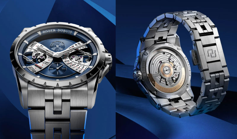 A entrada mais imediata na coleção é também a mais desportiva. O Excalibur Biretrograde Calendar em aço de 40 mm apresenta o mostrador de sete camadas na tonalidade Cosmic Blue, uma cor concebida para capturar o instante entre a luz do dia e a profundidade da noite, que muda de tom consoante o ângulo da luz. As duas escalas retrográdas em arco indicam o dia à esquerda e a data à direita com a precisão característica do sistema co-patenteado pelo fundador Roger Dubuis em 1989. O calibre automático RD840, com 60 horas de reserva de marcha e 14 técnicas de finissage distintas certificadas pelo Poinçon de Genève, é visível pelo fundo em safira. A bracelete de múltiplos elos em aço com sistema Quick Release completa uma proposta que equilibra identidade relojoeira e uso quotidiano.