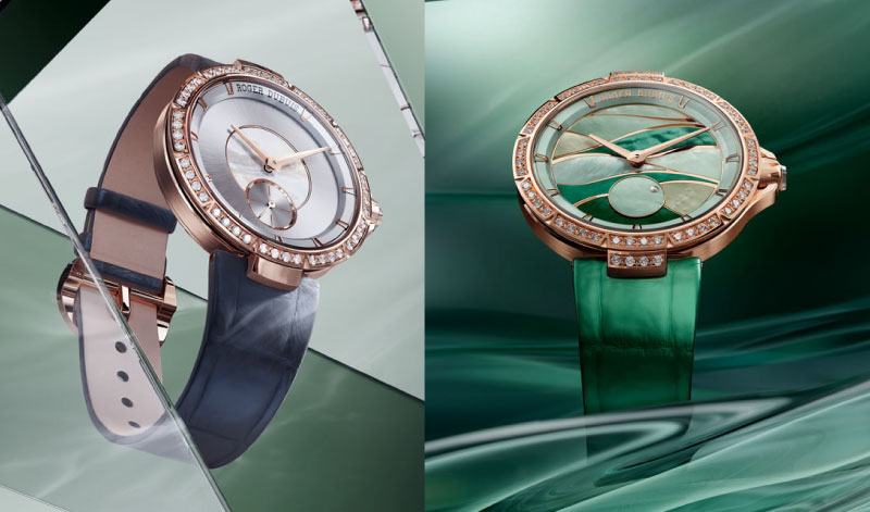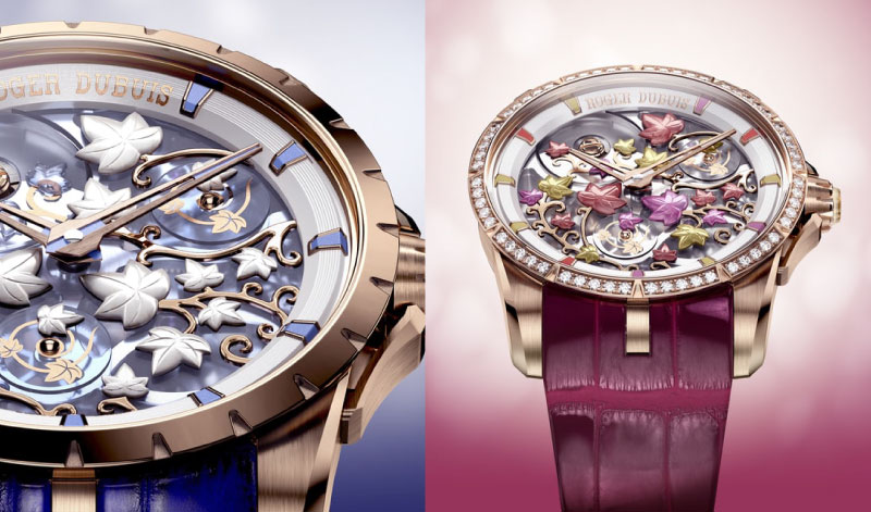 A floresta encantada que Viviane habita dá origem a dois relógios em ouro rosa de 38 mm, cada um capturando um momento diferente do mesmo lugar. O Twilight Blue representa o instante em que o crepúsculo dissolve a fronteira entre o real e o imaginário: sobre um mostrador de safira com laca azul-noite, hastes de hera em ouro rosa de 18 quilates transportam folhas de madrepérola gravadas à mão, enquanto dois discos livremente rotativos evocam o vento na copa das árvores. O novo calibre esqueletizado automático RD721SQ, com 14 decorações feitas à mão e Poinçon de Genève, é visível por baixo desta composição. Limitado a 88 exemplares. O Dawn Rose captura o instante oposto: as primeiras luzes da madrugada a inflamar a floresta. Sobre o mesmo mostrador em safira, as folhas de madrepérola recebem laqueados em amarelo, rosa e vermelho que evoluem como a aurora a atravessar a copa. Uma luneta de diamantes e um micro-rotor decorado completam uma peça que é, simultaneamente, um relógio e uma pintura. Igualmente limitado a 88 exemplares.