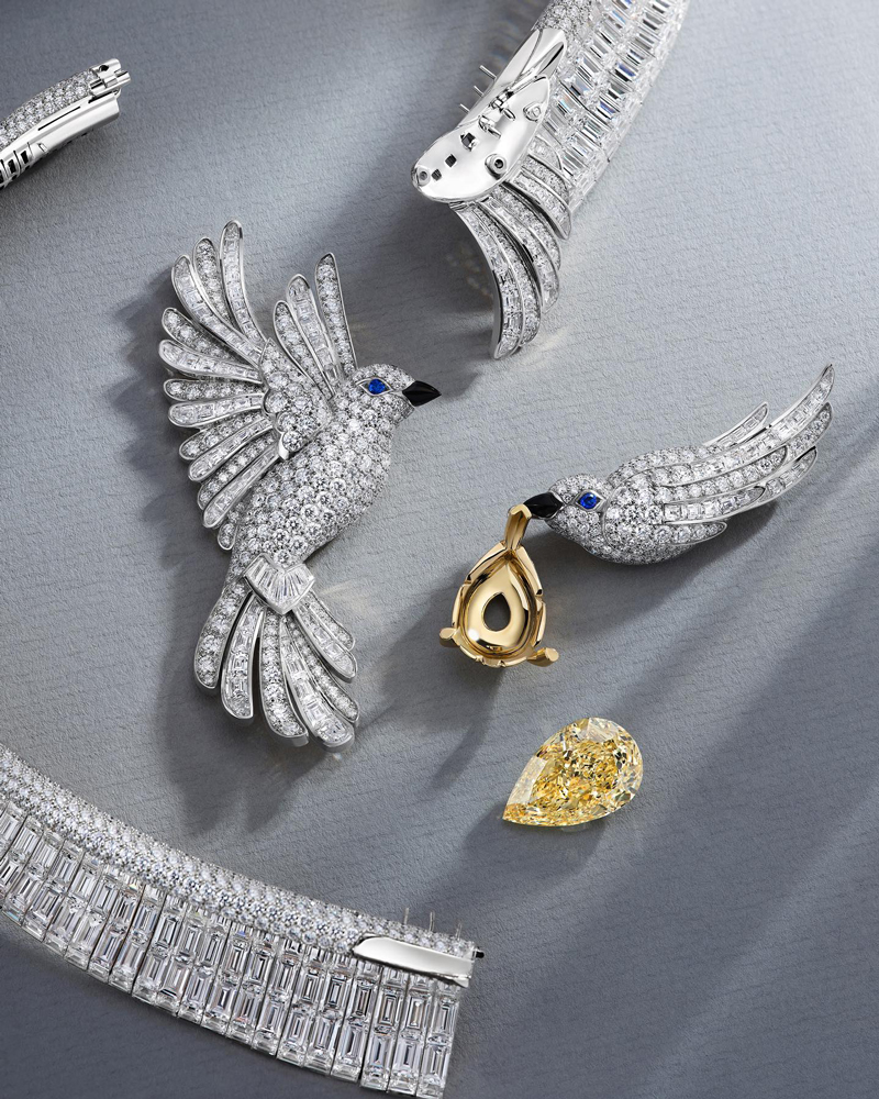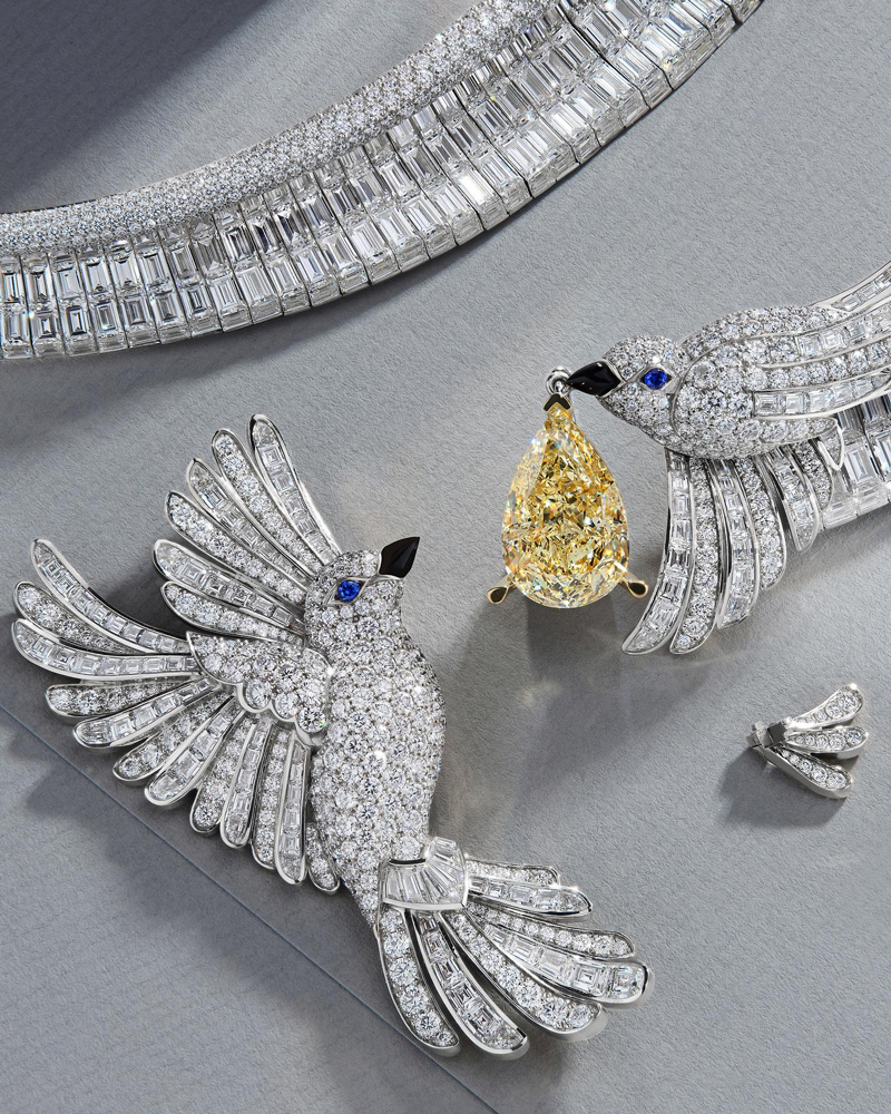 O colar exibe dois delicados pardais, aves que simbolizam amor e esperança, meticulosamente esculpidos em diamante. Um dos pardais segura um raro diamante amarelo Fancy Intense de 13,51 quilates em forma de pêra, representando uma oferenda de amor. O design estrutural e fluido da peça é realçado por 2.305 diamantes de corte pêra, brilhante redondo e baguete, totalizando 125 quilates.