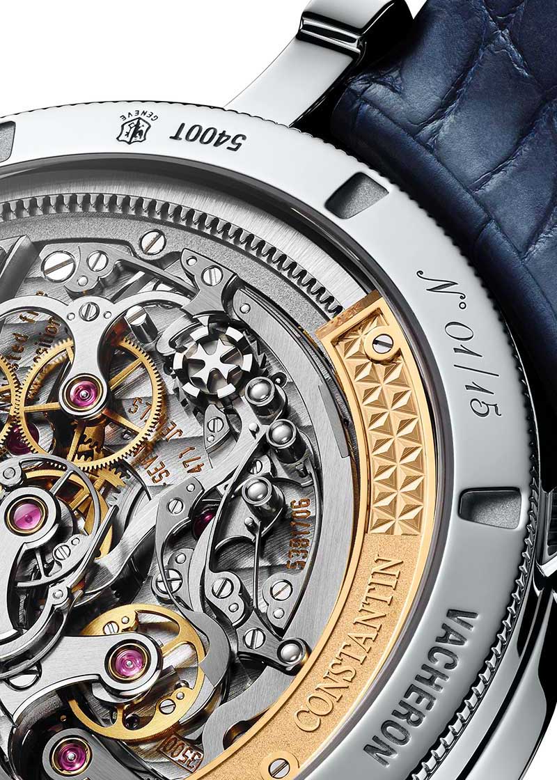 O novo Traditionnelle Cronógrafo Split-Second apresenta-se numa caixa de 42,5 mm em platina e está equipado com o calibre automático de manufactura 3500, um movimento com cronógrafo rattrapante com roda de coluna. É o calibre mais fino com este tipo de complicação, medindo apenas 5,2 mm de espessura, graças a uma massa oscilante periférica montada sobre esferas.