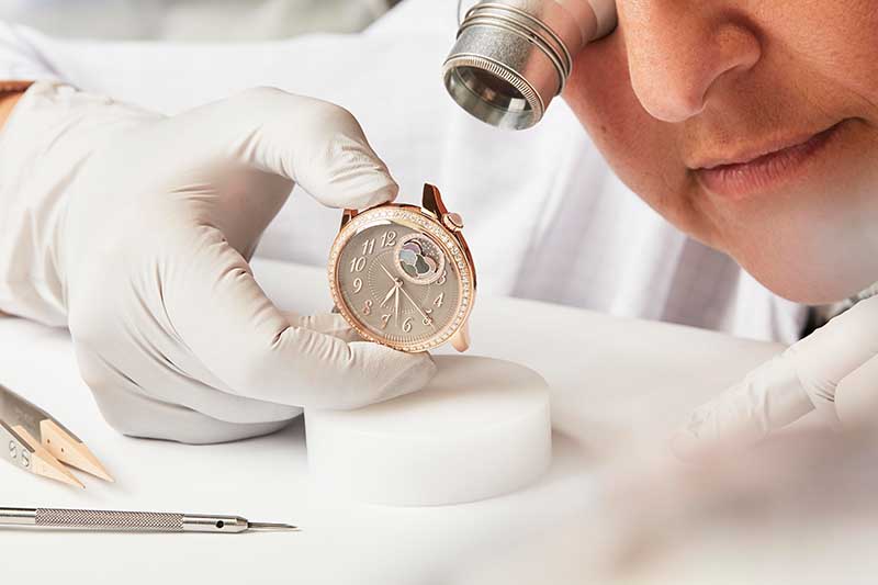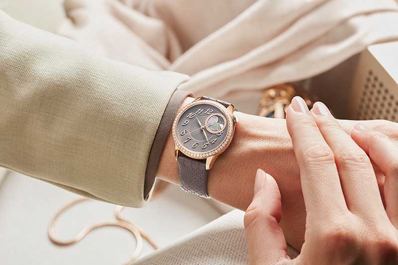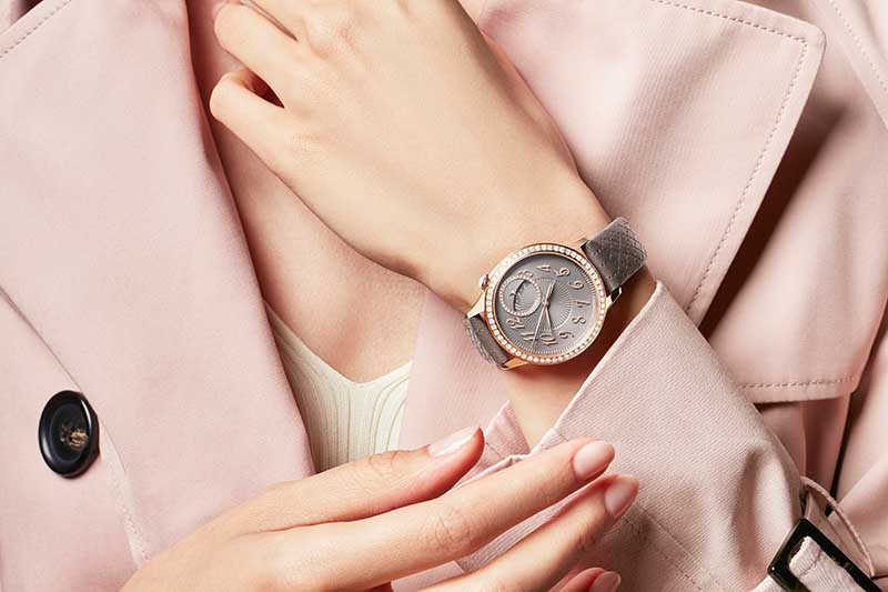 Os dois novos relógios que agora integram a colecção feminina Égérie destacam-se por apresentar uma tonalidade inédita nesta linha. Assim, os modelos exibem caixas em ouro rosa, com mostradores castanhos acinzentados, com o tradicional padrão de “pregas”, sublinhados por um círculo em ouro engastado com diamantes, que rodeia o indicador das fases da Lua ou da data, consoante o modelo.