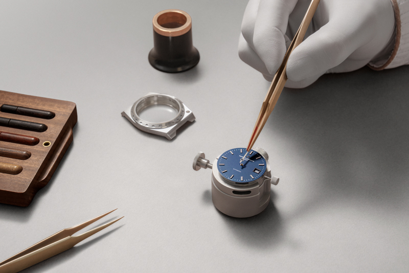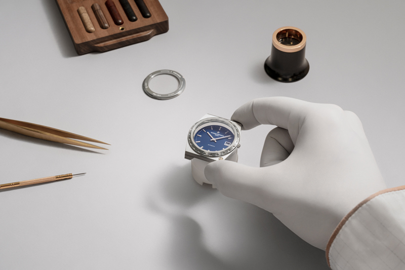 Por outro lado, esta reedição distingue-se em pontos cruciais. O movimento foi actualizado para o calibre 2455, um mecanismo de corda automática que oferece maior precisão e fiabilidade, operando a 4 Hz. Este novo movimento, visível através do fundo em vidro de safira transparente – uma adição moderna que contrasta com o fundo sólido do original –, exibe a massa oscilante decorada com o logótipo 222 e um padrão de ameias inspirado na luneta. O mostrador azul mantém a elegância minimalista, mas agora os ponteiros e marcadores são tratados com Super-LumiNova®, proporcionando melhor legibilidade em condições de pouca luz, uma melhoria em relação ao trítio utilizado anteriormente.