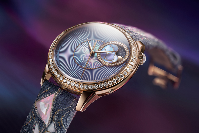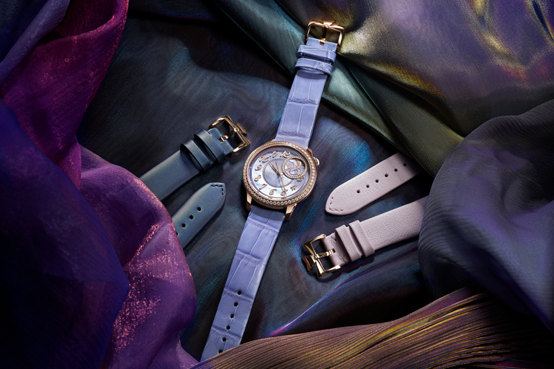 Com uma caixa em ouro rosa engastada de diamantes e um mostrador em madrepérola lilás adornado com plissados, o Égérie oferece uma experiência sensorial que transcende o simples objeto. A bracelete original de Alta-Costura é tecida com bordados requintados e incrustações de madrepérola, e contém uma fragrância criada pelo mestre perfumista Dominique Ropion.