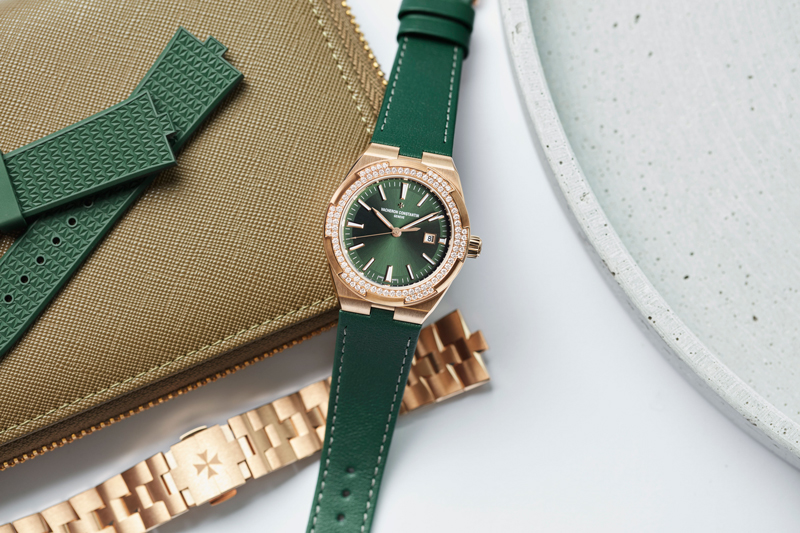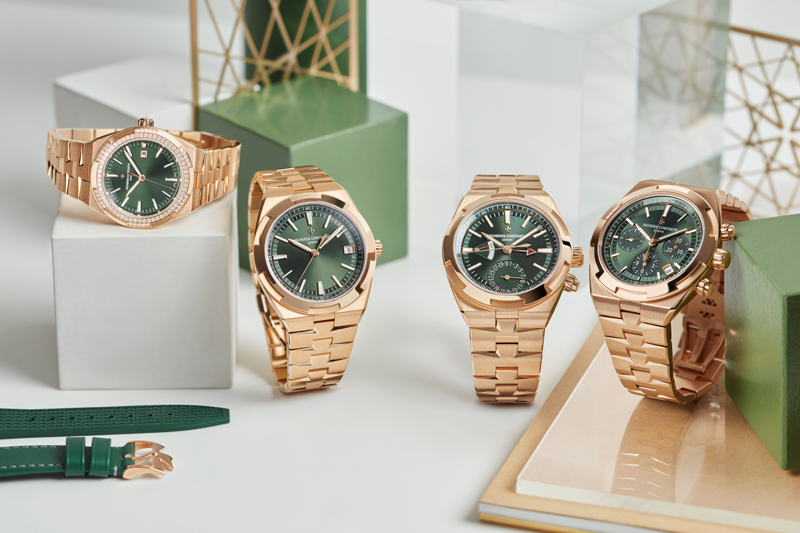 A coleção Overseas apresenta pela primeira vez mostradores verdes com acabamento acetinado no centro e acabamento aveludado na flange. Esta introdução de cor traz um novo visual para quatro modelos em ouro rosa: um cronógrafo, um de hora dupla, um de data em 41 mm e outro com 35 mm.