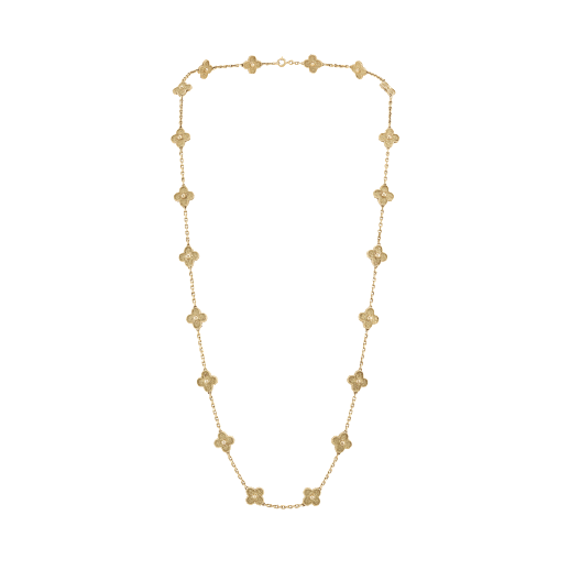 Em 1968, a Maison criou o primeiro colar longo Alhambra: inspirado no trevo de quatro folhas, combinava 20 motivos em ouro amarelo enrugado, com franjas de contas douradas. Um sucesso imediato, esta peça consolidou-se em todo o mundo como ícone da sorte e símbolo da Van Cleef & Arpels. Ao longo dos anos, a colecção foi-se renovando constantemente, assumindo variações requintadas de formas, tamanhos de motivos e materiais, e reinventando a arte de usar jóias.