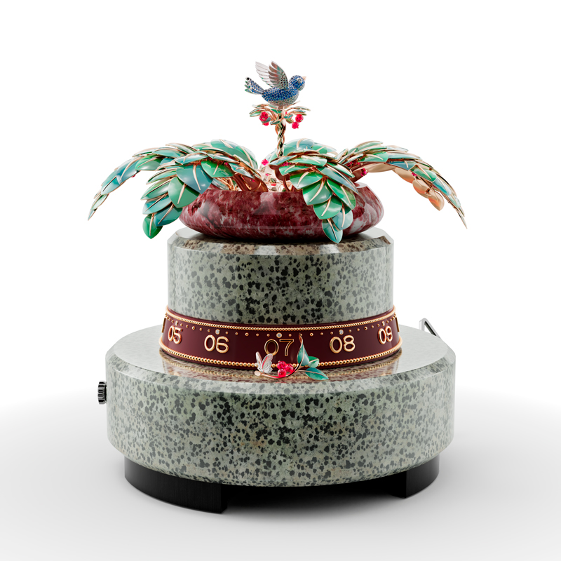 O autómato Apparition des Baies cativa com elegância e engenhosidade o espetador. As folhas envernizadas a ouro rosa dobram-se delicadamente para revelar um segredo encantador: um pássaro em ouro branco, diamante e safira emerge do bouquet. Desenhado para imitar o voo, o pássaro, após a sua breve apresentação, regressa à posição inicial enquanto as folhas se fecham suavemente. Esta maravilhosa interação é possível graças a um novo sistema rotativo interno desenvolvido especialmente pela Maison, composto por 112 folhas meticulosamente sobrepostas e entrelaçadas. A base do autómato é adornada com jaspe dálmata e uma taça de thulite, um mineral raro com tons de cor de rosa, escolhidos a dedo por gemólogos da Maison para realçar a beleza desta peça. Uma borboleta em ouro branco, pousada num ramo em ouro rosa, observa a passagem das horas, indicadas num anel rotativo adornado com contas douradas e índices em ouro amarelo e diamantes, enquanto uma melodia suave completa esta experiência poética e encantadora.