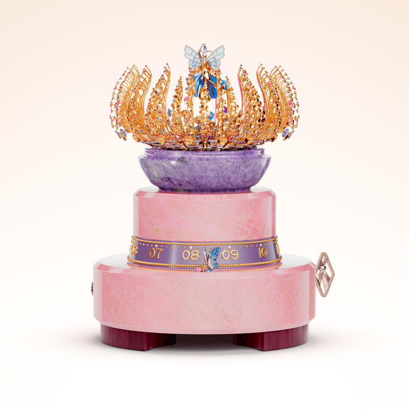 O autómato Bouton d'Or é uma referência à tradição e herança da Maison, homenageando a coleção de joias com o mesmo nome e reinterpretando o icónico motivo "paillette", criado nos anos 30. As paillettes, côncavas ou convexas, evocando lantejoulas da alta-costura, ganham vida em forma de um bouquet em ouro brilhante. Os tons rosa da base de thulite complementam as tonalidades violeta da taça de charoite e criam uma harmonia moderna e tradicional. O autómato apresenta uma fada bailarina, com um diamante lapidado em rosa na sua face, cujas asas de esmalte plique-à-jour a fazem rodopiar sobre um canteiro florido, segurando um diamante briolette entre os dedos e com um vestido em ouro rosa acabado com verniz azul.