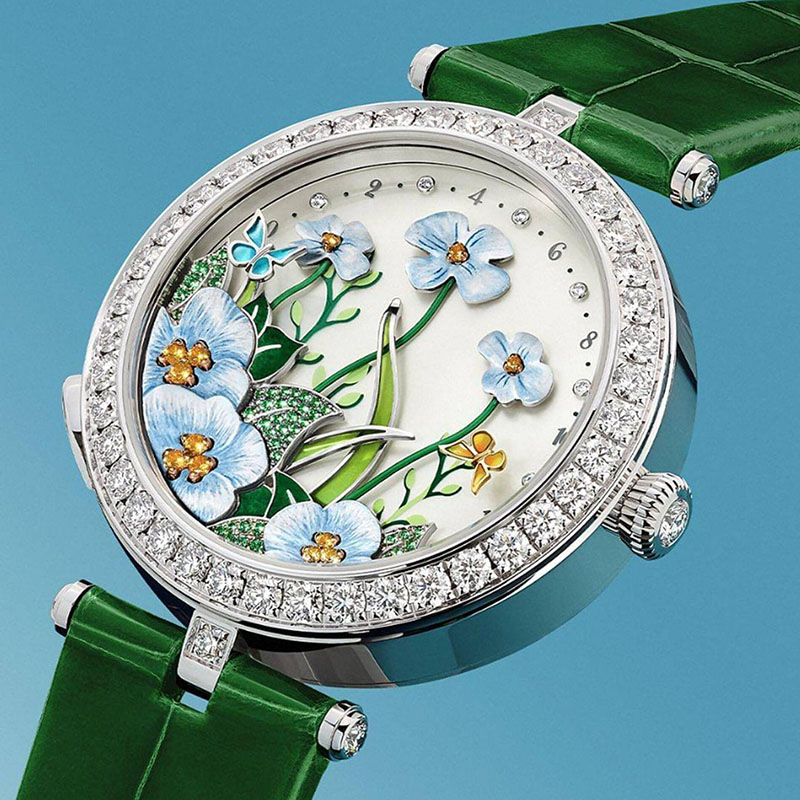 É o caso do novo Lady Arples Brise d’Été, que evoca um bouquet repleto de vida, através de borboletas em ouro branco e amarelo com esmalte plique-à-jour, que não só indicam as horas, mas também ganham vida graças a um módulo de animação a pedido. As corolas em esmalte com tons de azul, destacadas por pistilos de granada espessartita, são meticulosamente pintadas à mão, criando uma paisagem poética que retrata a harmonia entre o tempo e a natureza.
