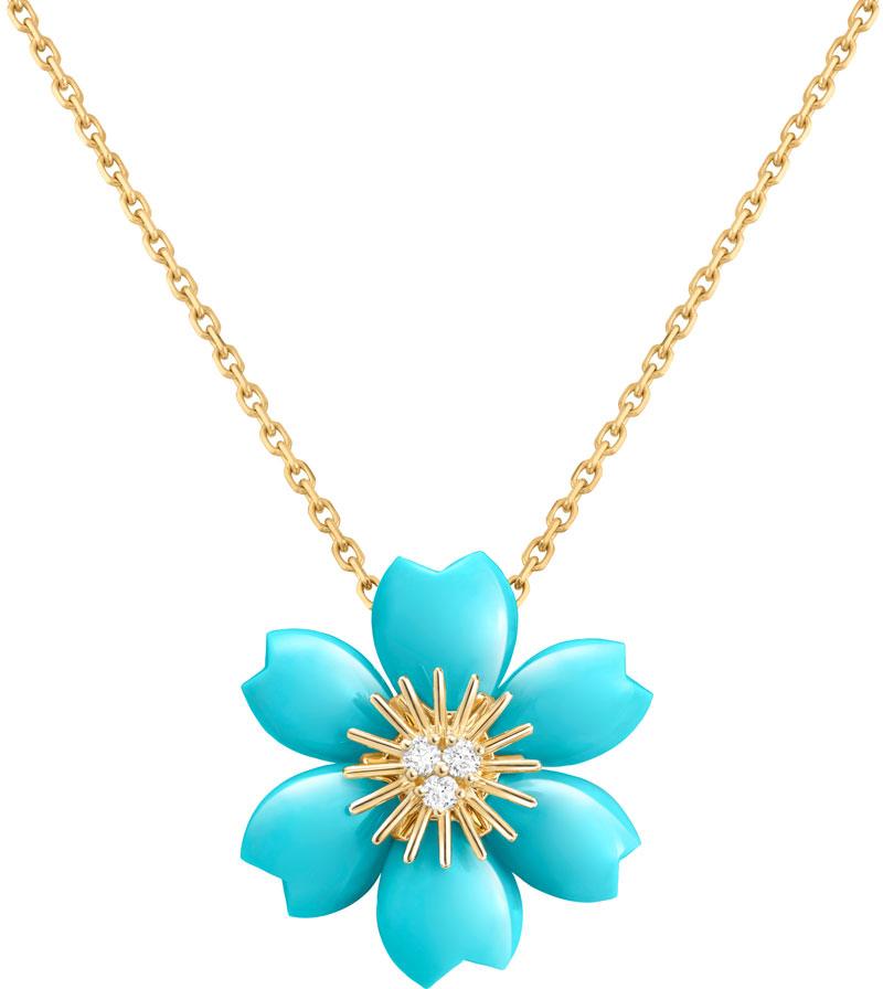 Aliando magistralmente diamantes e pedras preciosas, as últimas adições - compostas por dois pares de brincos e dois pendentes - são oferecidas em duas combinações que reflectem a experiência em pedras preciosas da Van Cleef & Arpels: madrepérola cinzenta com ouro branco ou turquesa com ouro amarelo. Os designs em camadas conferem a cada peça uma sensação de movimento, como se as pétalas estivessem a balançar.
