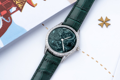Numa caixa de 40 mm em ouro branco, os flancos, a luneta e as asas são engastados com 146 diamantes em lapidação baguete – sem esquecer o diamante invertido em lapidação brilhante na coroa. Técnica rara que data do século XVI, a arte da grisaille produz um efeito claro-escuro e envolve a aplicação de camadas de esmalte branco de Limoges sobre uma base de esmalte escuro. Queimado repetidamente num forno, as formas do dragão ganham forma e o esmaltador finaliza o processo com uma fina camada de esmalte translúcido de cor verde para realçar os contrastes.