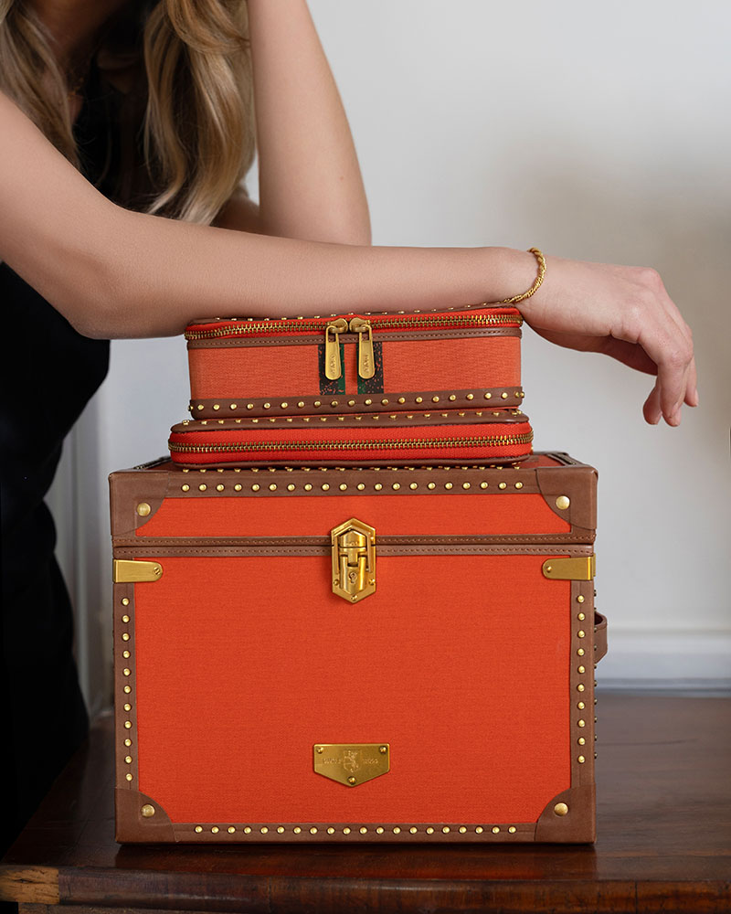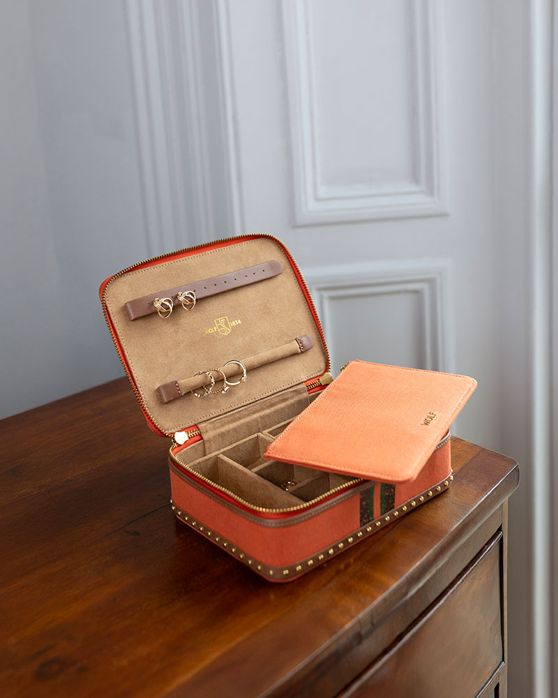 A colecção Ida, da Wolf, passa a incluir o novo Ida Trunk Style Jewellery Box em laranja, que se junta à versão em caqui, bem como dois estojos de viagem para jóias disponíveis em ambas as cores. Os exteriores em lona reciclada, enriquecidos com detalhes em latão e acabamento em pele, evocam a estética vintage das malas de viagem.