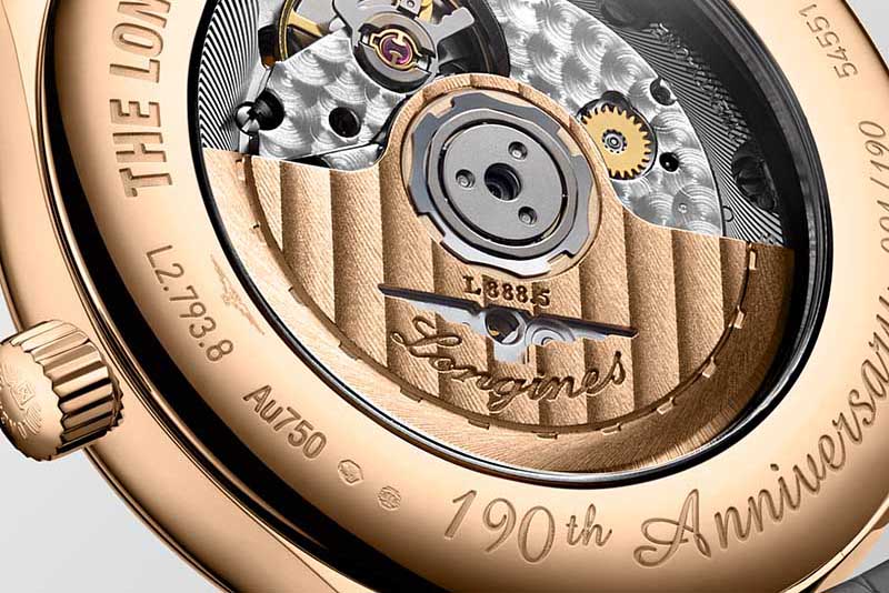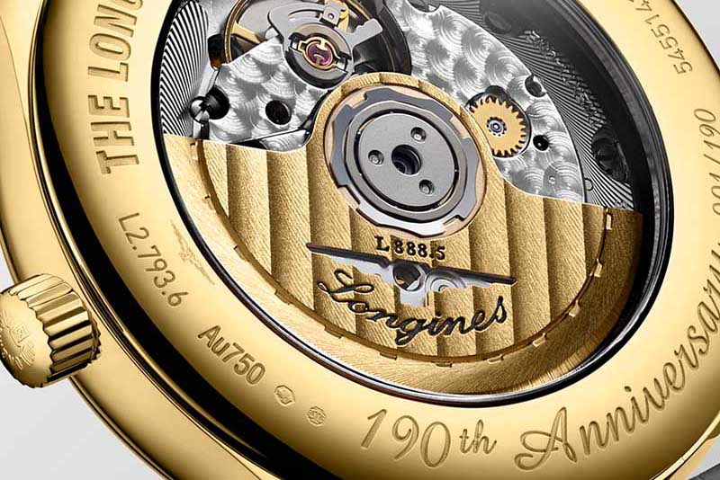 Automático, calibre de manufactura L888.5, massa oscilante a combinar com a caixa do relógio, 25.200 alt/h, 72 horas de reserva de marcha.