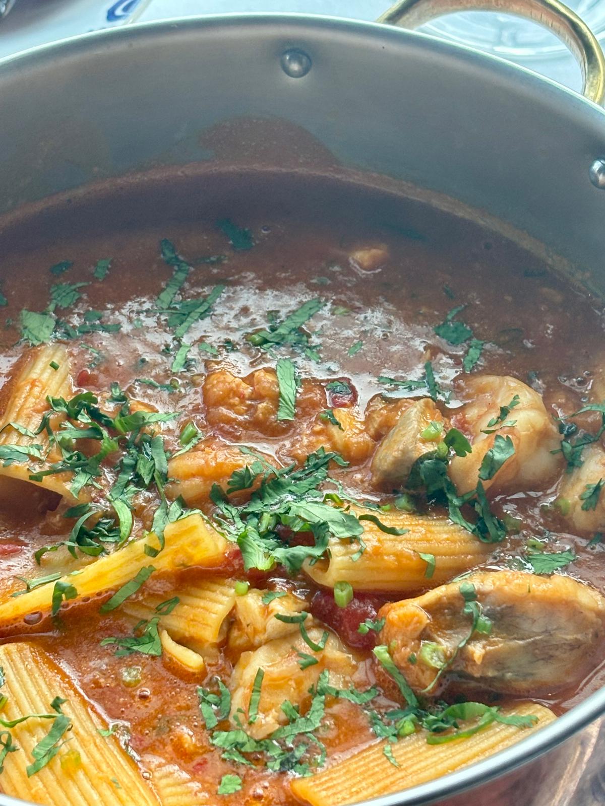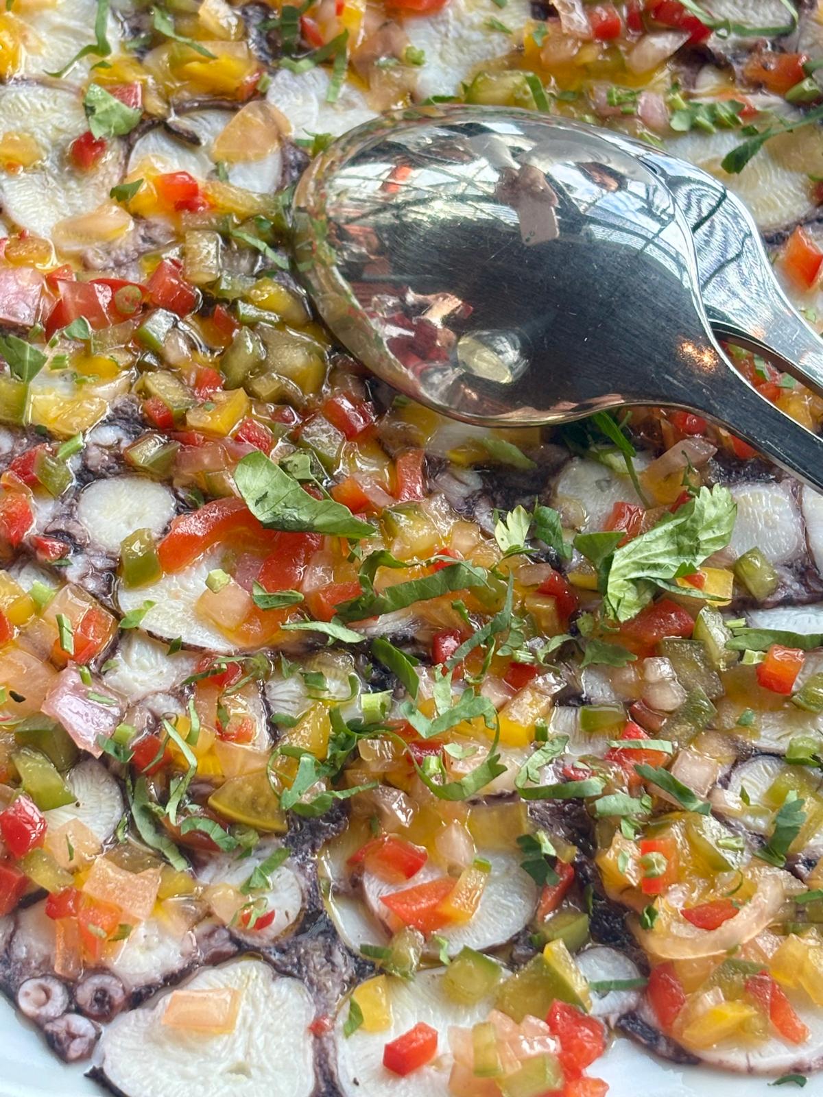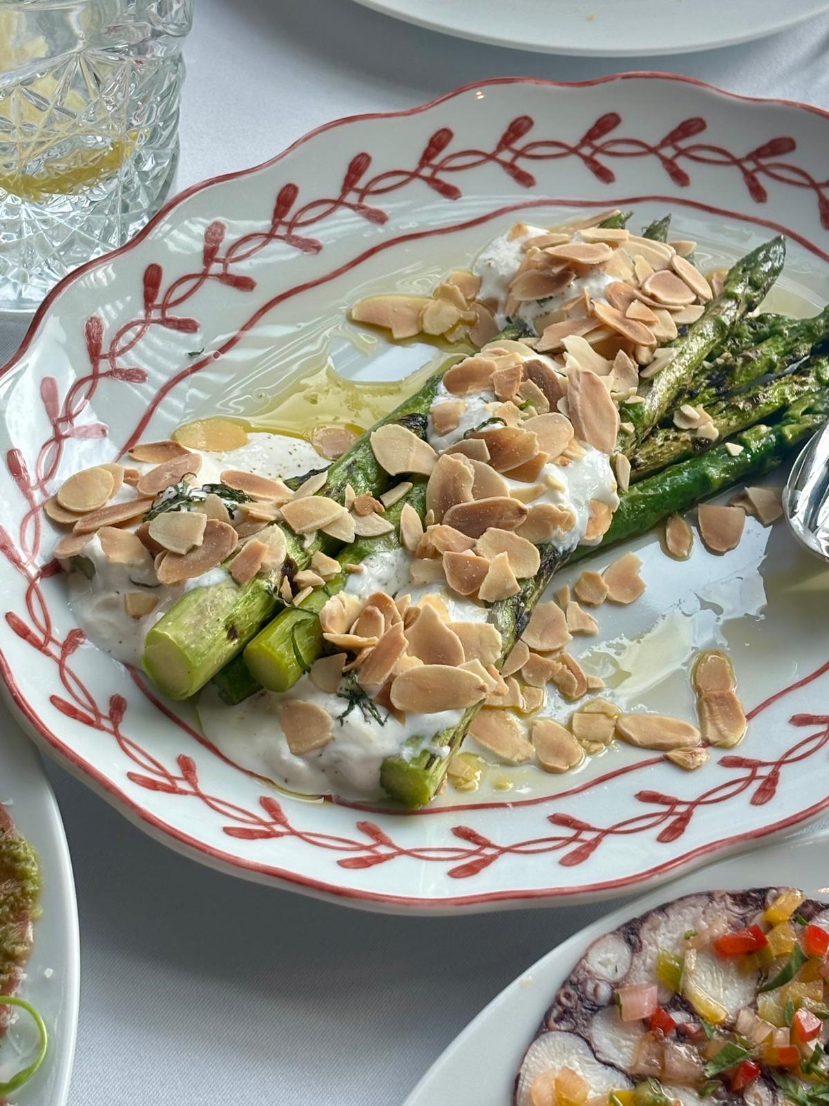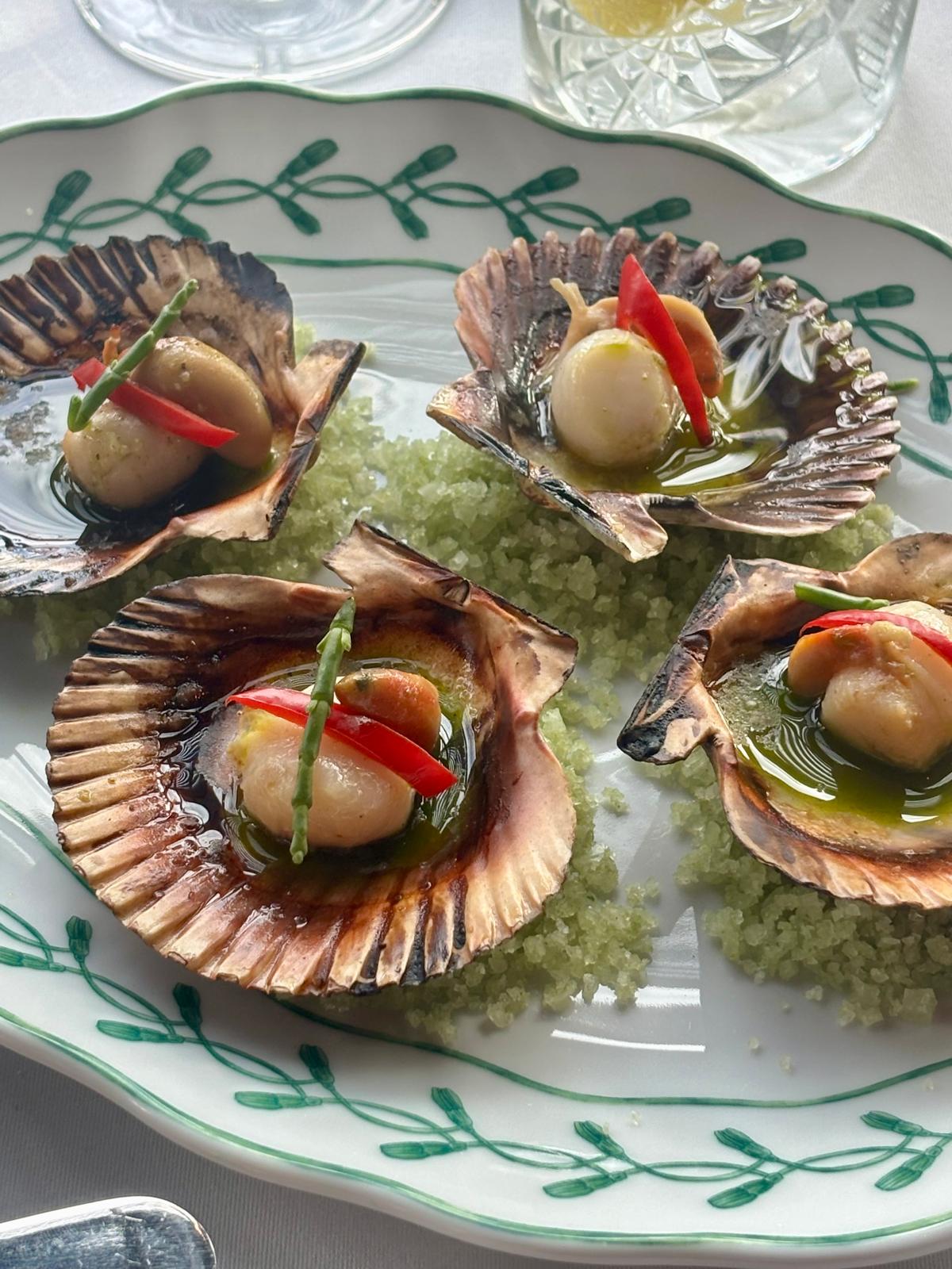 Foi neste contexto que decorreu o almoço a convite da casa, dedicado à degustação da carta e que contou com uma mesa partilhada exclusivamente por mulheres. Entre conversas animadas, a experiência gastronómica começou pelas entradas, que reflectem bem a linha da cozinha: carpaccio de novilho com rúcula, parmesão e pesto, equilibrado e directo; carpaccio de polvo com molho de pimentos, com boa textura e tempero; vieiras grelhadas com salicórnia, bem executadas no ponto de cozedura; e espargos grelhados com stracciatella e pesto, opção vegetal bem integrada no conjunto.