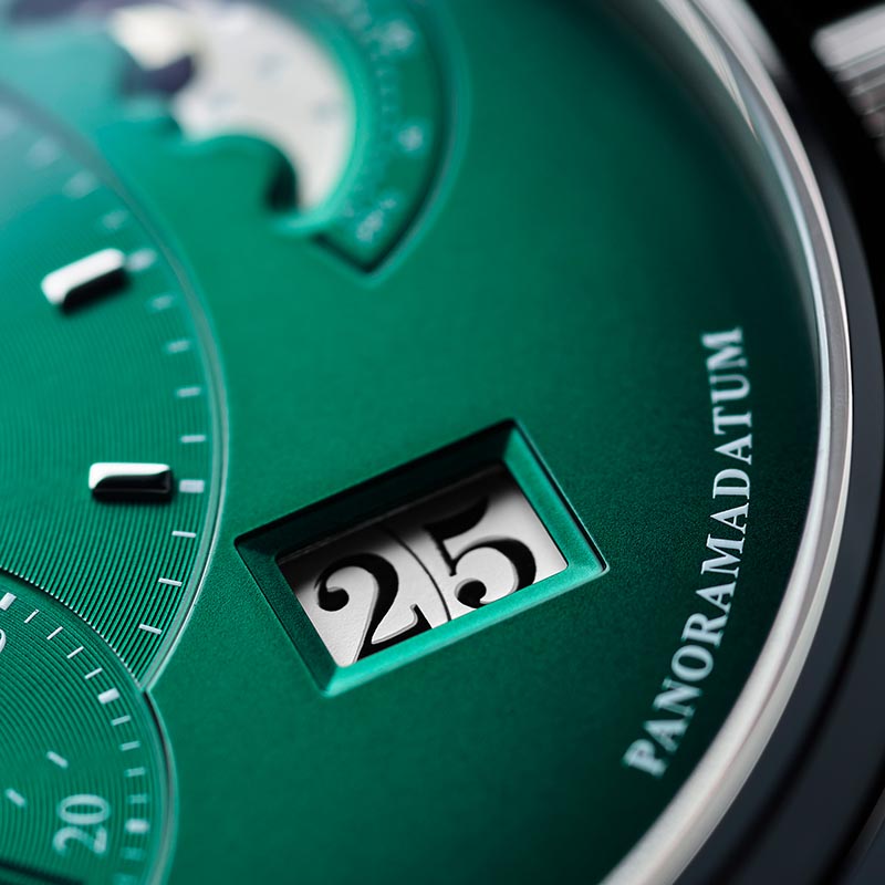 PanoMaticLunar: Verde floresta com efeito gradiente, apliques e ponteiros revestidos a ródio, ponteiros das horas e minutos com Super-LumiNova, indicação de horas, minutos, pequenos segundos, Data Panorâmica e fases da Lua.