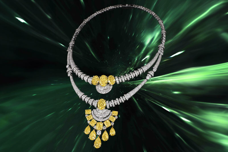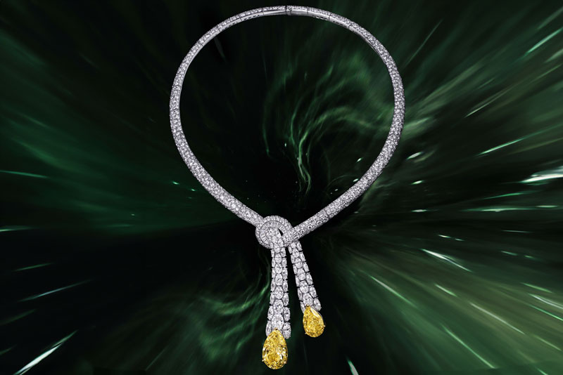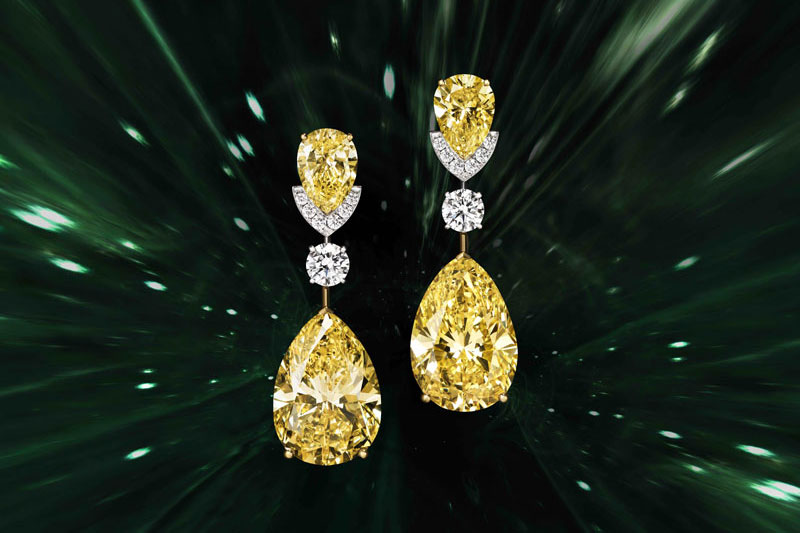 Destaque ainda para os brincos com diamantes de lapidação radiante Fancy Yellow de 21 quilates, rodeados por intrincadas filas de diamantes brancos, combinados com um anel de diamantes de lapidação almofada Fancy Intense Yellow de 36 quilates e um anel de diamantes de lapidação almofada Fancy Intense Yellow de 9 quilates que traça uma meia-lua escultural engastada com diamantes brancos para criar uma declaração marcante.