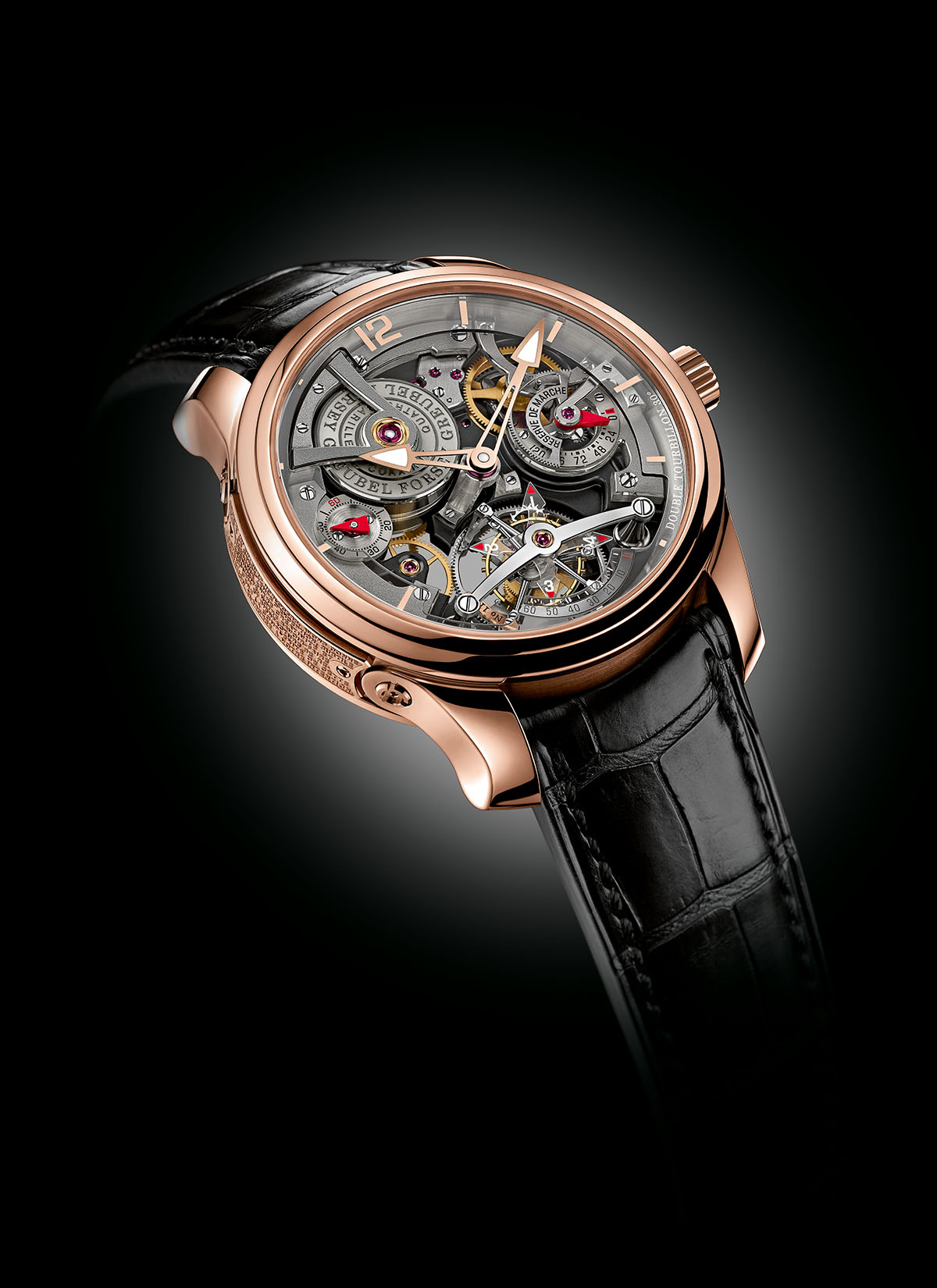 Esqueletizado, indicador de reserva de marcha às 3h, pequenos segundos às 9h, duplo turbilhão às 6h