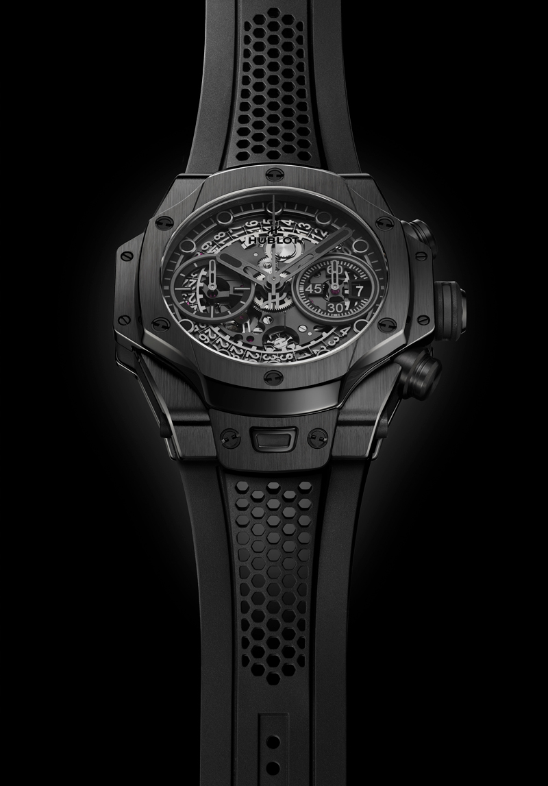 Limitado a 200 peças, o relógio apresenta uma estética monocromática em cerâmica preta, acompanhada por uma correia de borracha com padrão de favo de mel, criada especificamente para esta edição. A caixa de 42 mm combina superfícies acetinadas e polidas, mantendo a geometria modular característica da linha Big Bang.