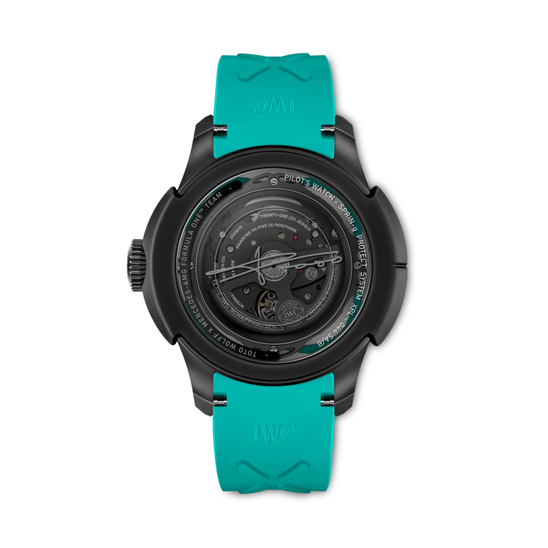 O coração deste modelo é o calibre IWC 32101, um movimento automático com reserva de marcha de 120 horas. Todos os componentes do movimento foram escurecidos para manter a estética monocromática e podem ser admirados através do fundo em vidro safira fumado, que exibe a assinatura de Toto Wolff. A estanqueidade de 10 bar reforça o carácter desportivo e robusto deste relógio.