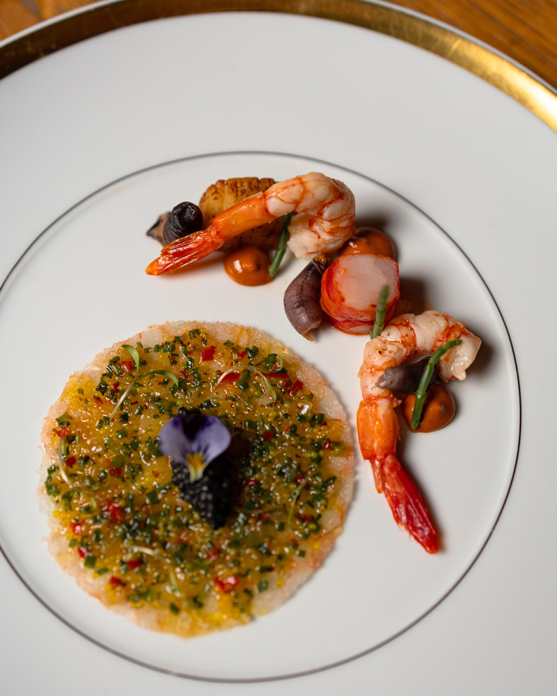 Este espaço apresenta um Menu de Degustação exclusivo por 95€ por pessoa (bebidas não incluídas). A experiência gastronómica inicia-se com snacks como mini tartelete de atum e ostras com beterraba. As entradas incluem espargos com pinhão e presunto, ceviche de vieira e tortellini de pato. Como pratos principais, destacam-se o linguado com funcho e a pintada com salsify. Para finalizar, as sobremesas incluem maracujá com hibiscus e pistáchio com lima. A harmonização vínica está disponível por 45€.