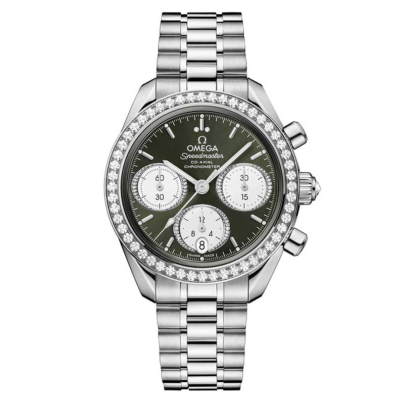 O novo Omega Speedmaster 38 em aço destaca-se pela luneta engastada com diamantes de lapidação brilhante, cujo brilho se estende ao mostrador verde ou castanho com contadores ovais prateados, também estes contornados por diamantes. A mesma pedra preciosa encima a coroa, substituindo o habitual logótipo Omega. Destaque ainda para a bracelete integrada de cinco elos no mesmo metal que a caixa. O Speedmaster 38 é movido pelo calibre 3330 Co-Axial Master Chronometer. Um movimento cronógrafo automático com roda de colunas e 52 horas de reserva de marcha.
